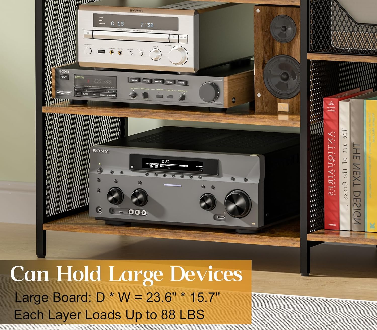 - ใ๐๐ฒ๐ฎ๐๐ ๐๐๐๐ & ๐ฆ๐๐๐ฟ๐ฑ๐ ๐ฆ๐๐ฟ๐๐ฐ๐๐๐ฟ๐ฒใ: ---Metal tubes as supporting frame, thicken engineered wood as worktop. The top shelf of the stereo stand cabinet can load weight up to 150lbs, other shelves up to 88lbs. Its structure is very sturdy and be durable.