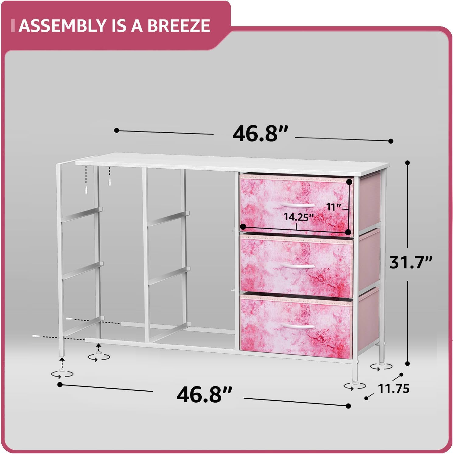 - Trendy Design: Sleek, wide storage design complements modern, boho, glam, and retro decor styles. Made with a strong steel frame and durable MDF wood top. Drawers are made of non-woven fabric. Minimal assembly required. Hardware and instructions included. Entire dresser measures approximately 46.85 x 11.73 x 31.69 in. Drawers measure 14.37 x 11.2 x 8.27 in.