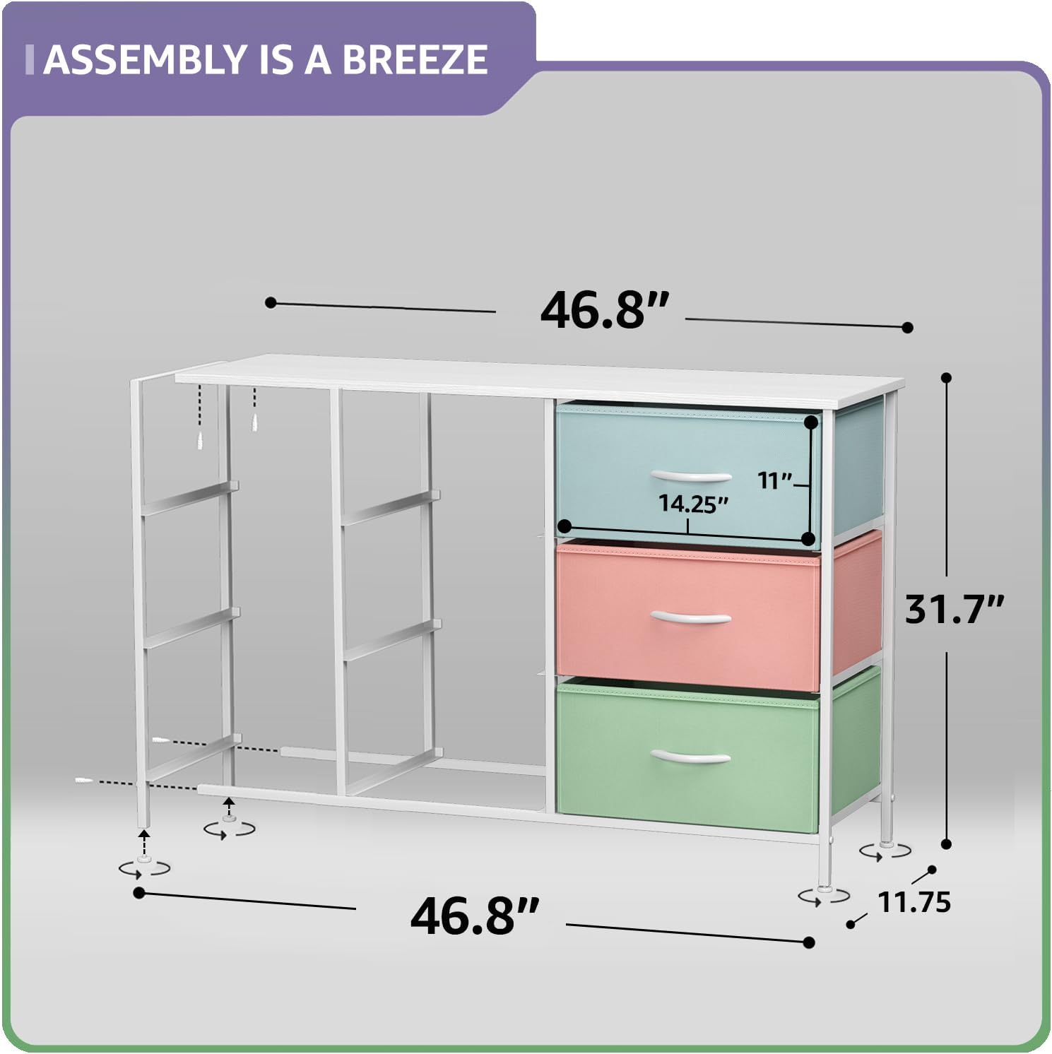 - Trendy Design: Sleek, wide storage design complements modern, boho, glam, and retro decor styles. Made with a strong steel frame and durable MDF wood top. Drawers are made of non-woven fabric. Minimal assembly required. Hardware and instructions included. Entire dresser measures approximately 46.85 x 11.73 x 31.69 in. Drawers measure 14.37 x 11.2 x 8.27 in.