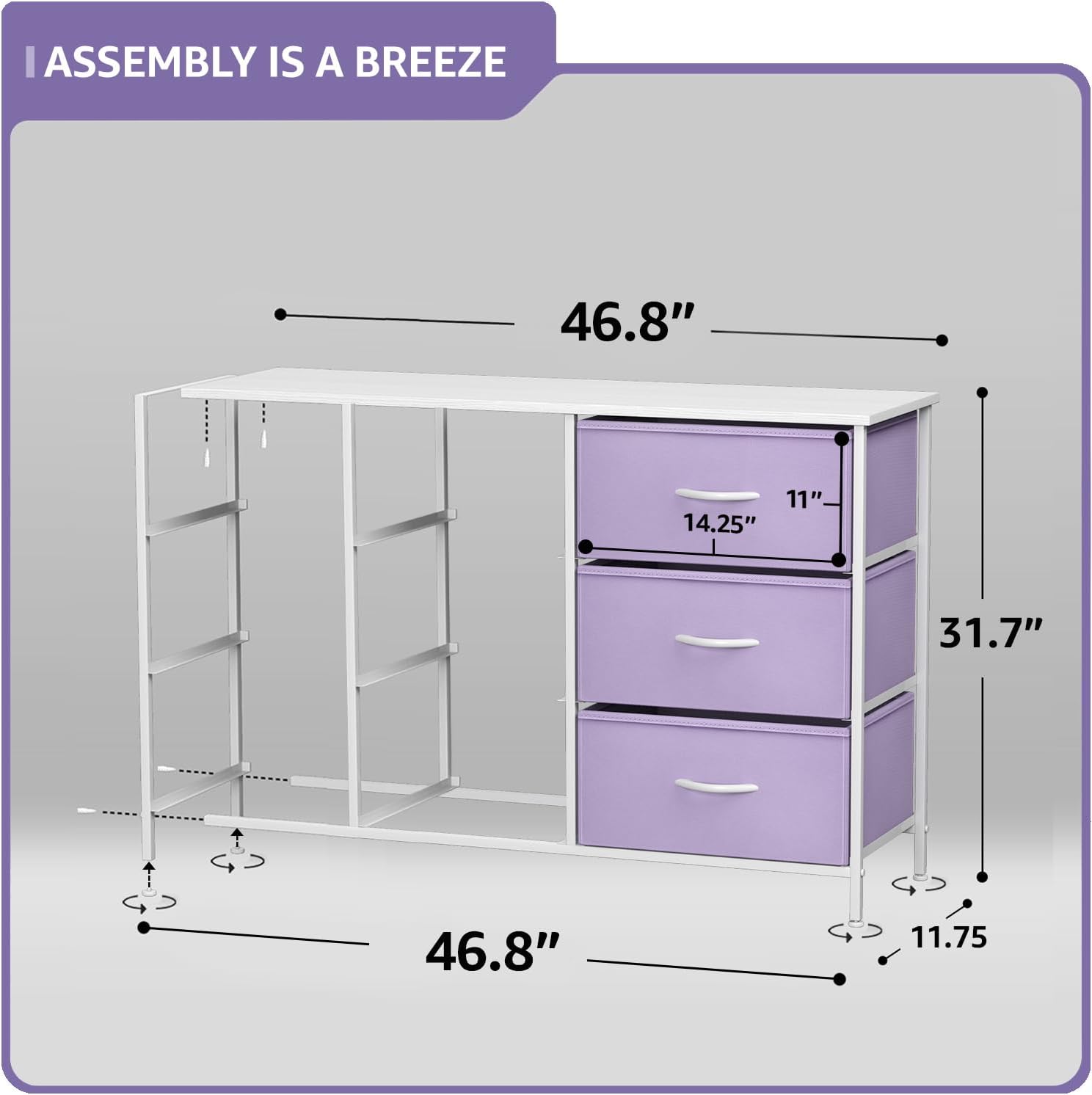- Trendy Design: Sleek, wide storage design complements modern, boho, glam, and retro decor styles. Made with a strong steel frame and durable MDF wood top. Drawers are made of non-woven fabric. Minimal assembly required. Hardware and instructions included. Entire dresser measures approximately 46.85 x 11.73 x 31.69 in. Drawers measure 14.37 x 11.2 x 8.27 in.