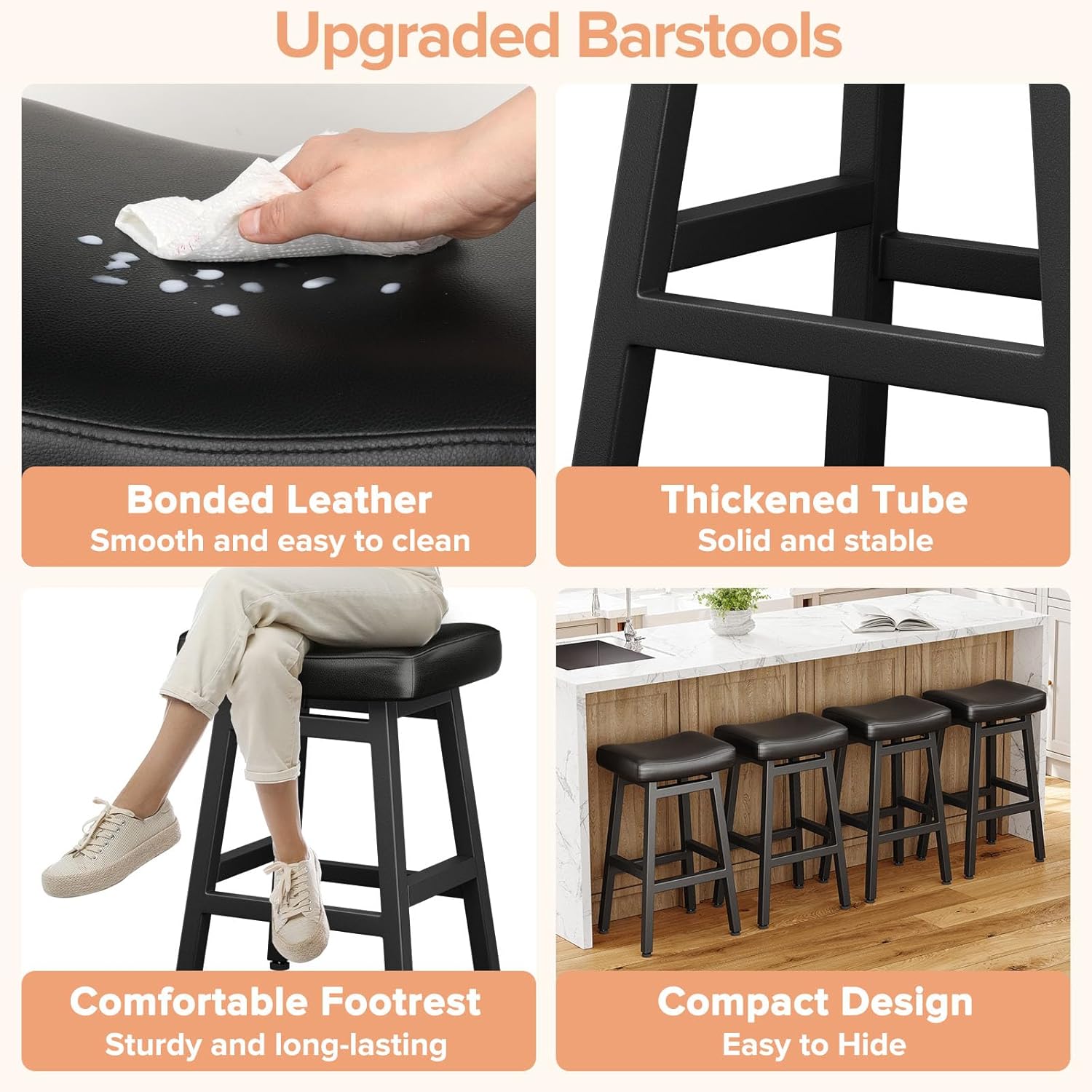 29 Inches Bar Stools Set of 2, Bar Height Barstools for Home Counter, Blackless Barstool with Bonded Leather Saddle Seats & Heavy Duty Metal Legs, Easy Assembly, All Black