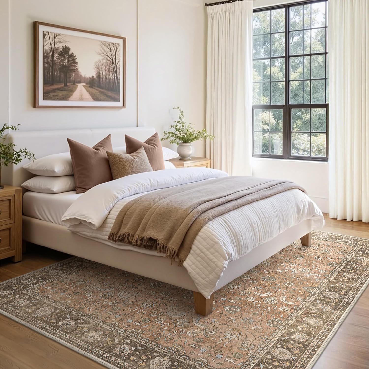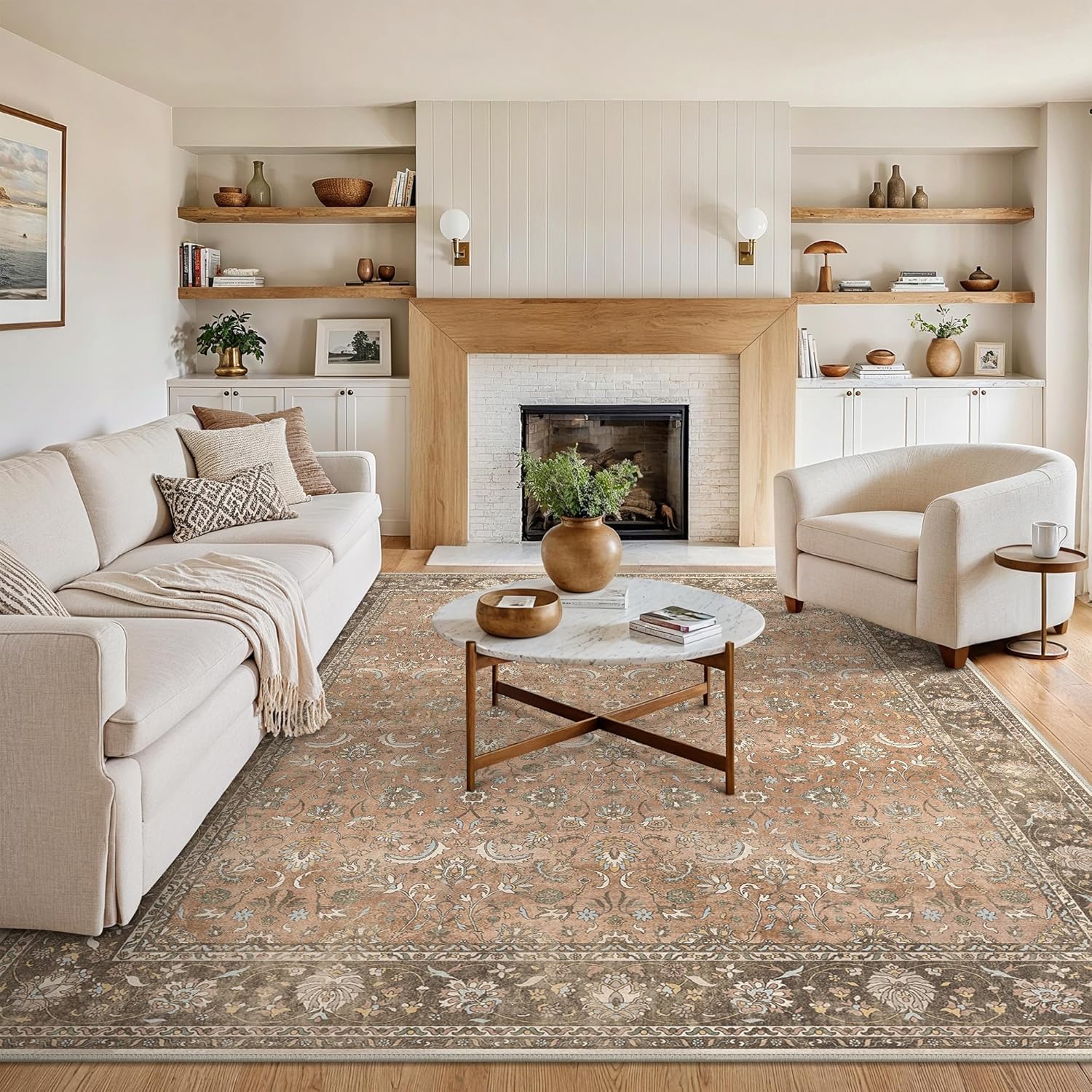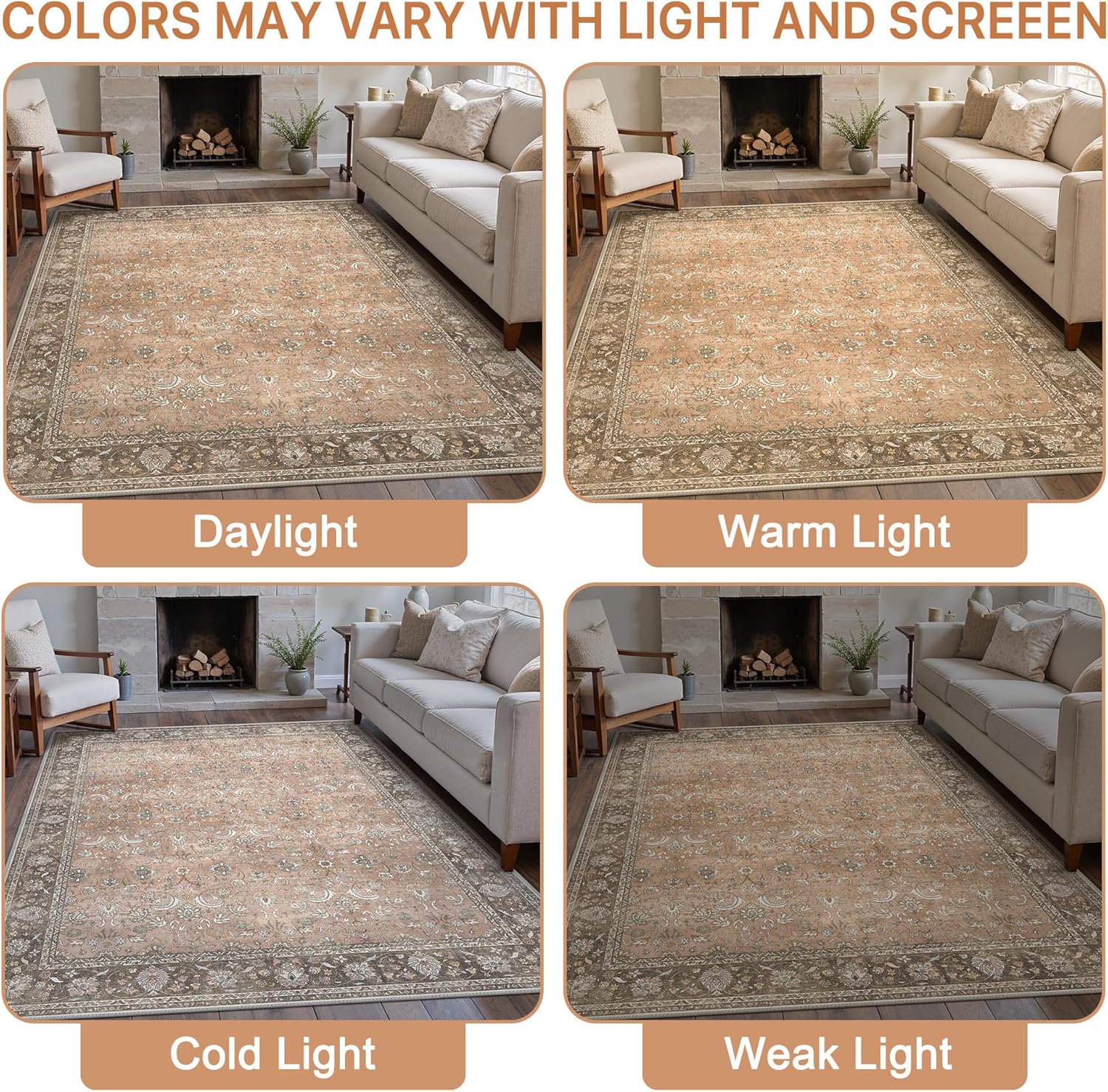 8X10 Area Rugs Machine Washable Rugs for Living Room, Vintage Boho Large Rugs for Bedroom Dining Room, Non Slip Indoor Soft Distressed Lightweight Thin Low Pile Carpet, Chestnut