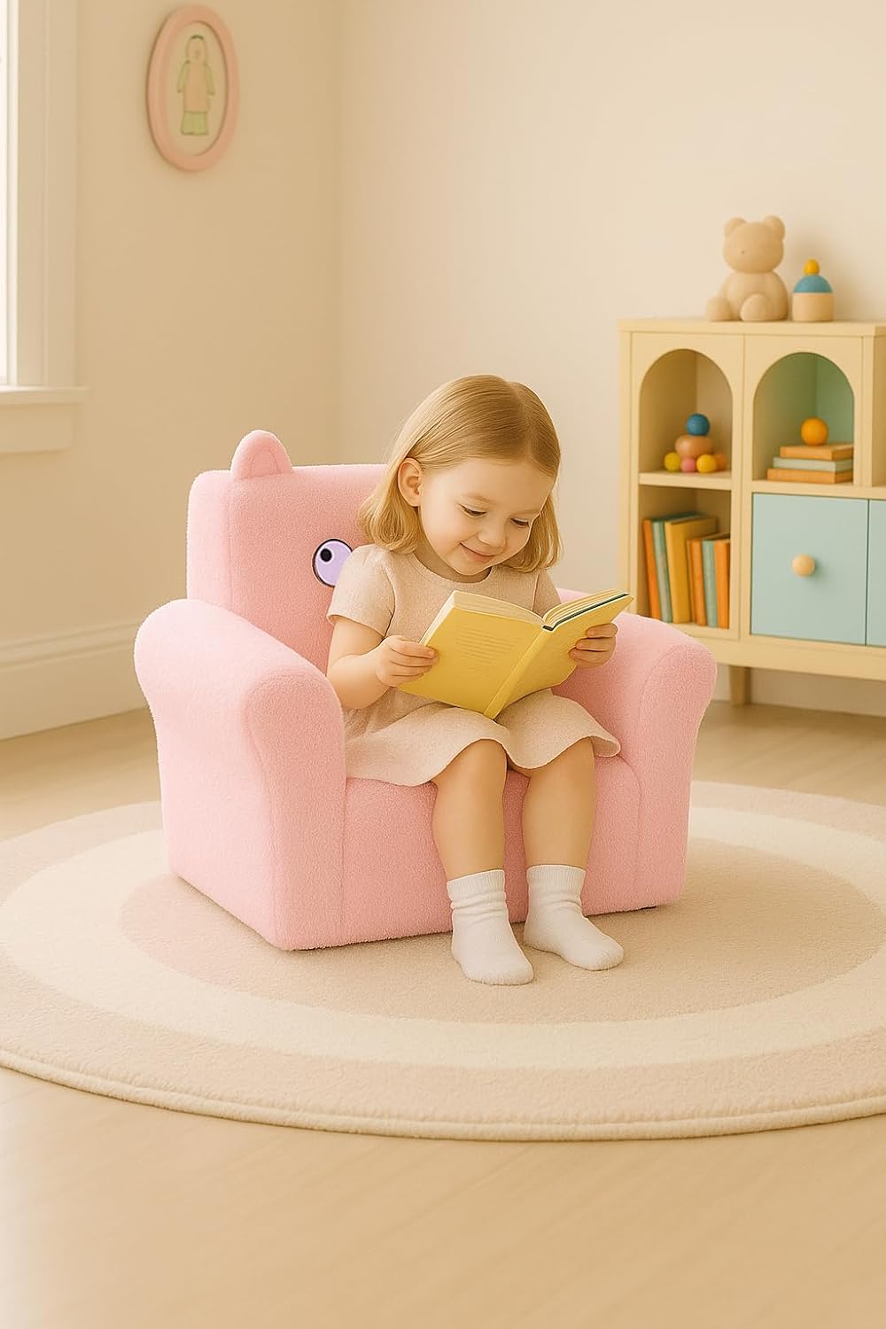 Cute Animal Toddler Foam Chair, Soft Faux Rabbit Fur, Comfy Toddler Lounge Chair and Couch with Arms, Removable Washable Cover, Kids Reading, Relaxing, for Playroom, Bedroom, Ages 1-3, Pink Cat