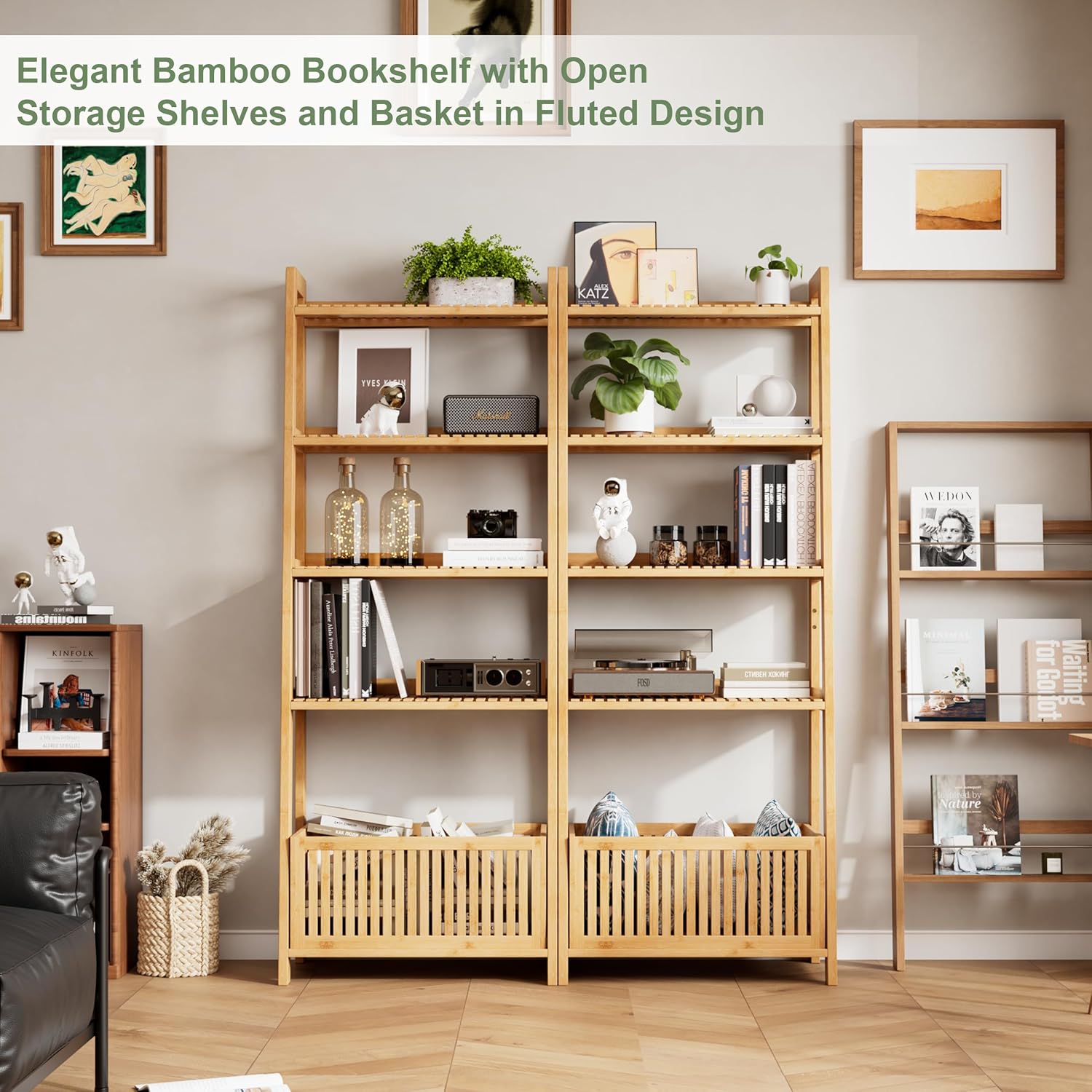 Bamjoy Bamboo Ladder Shelf, Bookshelf with 4 Display Shelves and 1 Open Storage Basket, Multifunctional Storage Rack Organizer for Home Office, Bedroom, Living Room, 66” H Natural