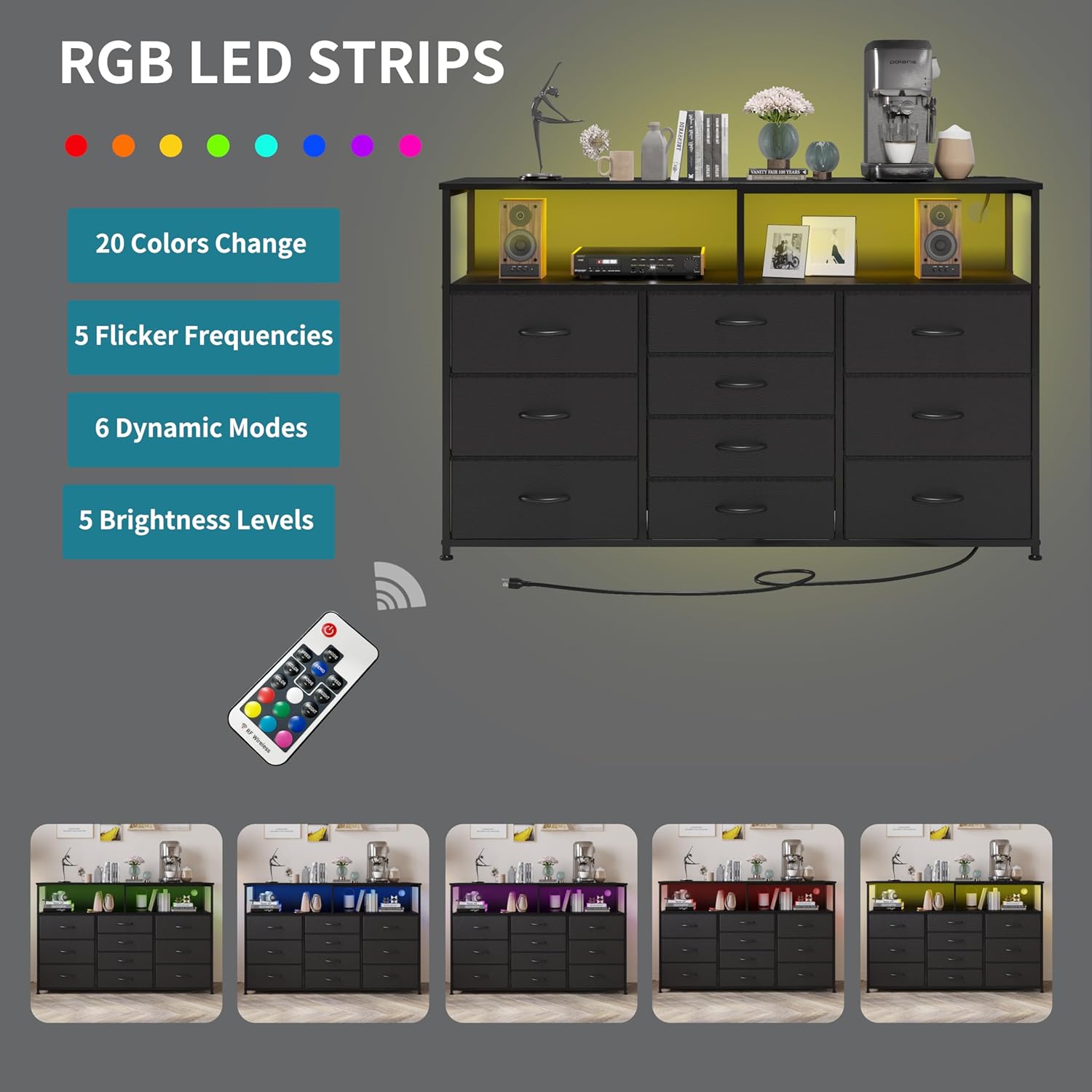 55W 10-Drawers Dresser with 2 Open Storage Shelves, TV Stand Dresser for 55,65 inch TV,with Power Outlets and LED Lights, Fabric Dressers Drawers for Bedroom, Living Room (Black)