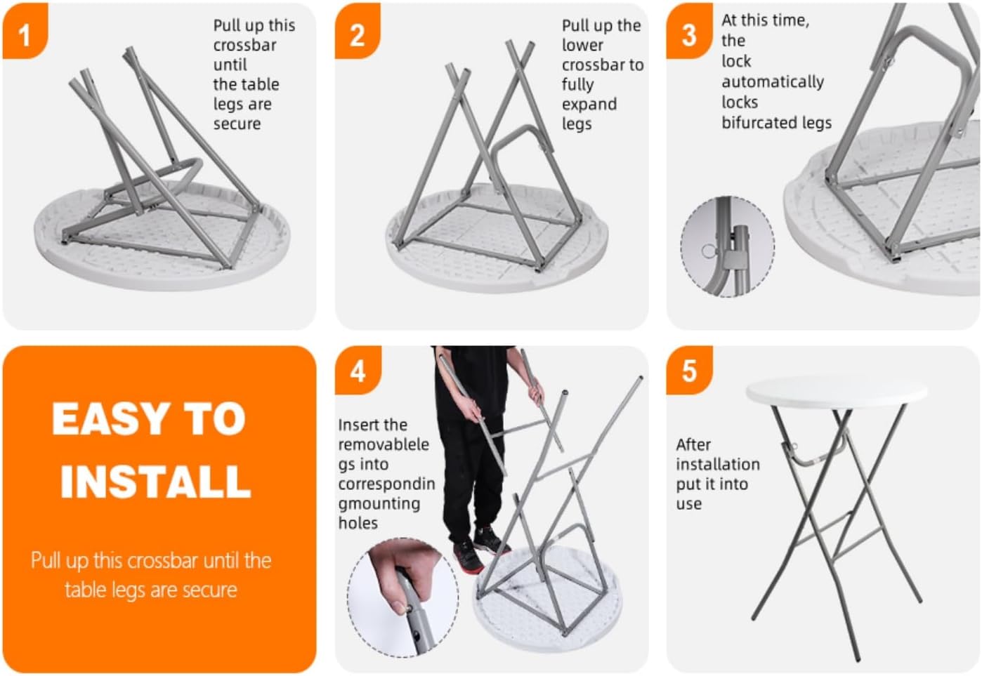 - EASY TO INSTALL:2.63' round folding table When installing, unfold the legs fixed on the desktop, then insert and lock the split legs in the form of a combination rod. In just a few minutes you will have a simple, functional and elegant bar height folding table.