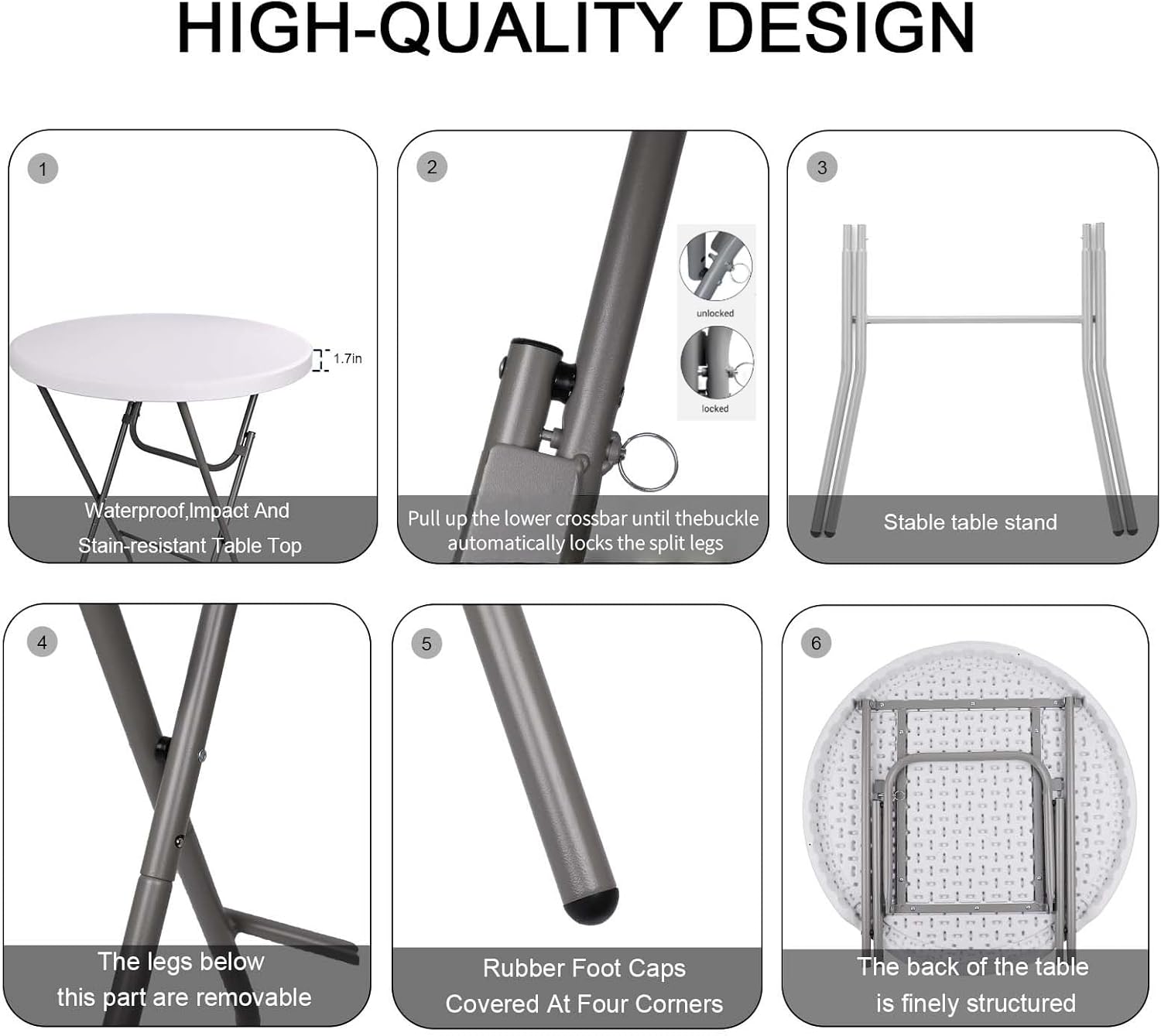 - PORTABLE DESIGN:folding pub table Powder-coated steel legs feature a locking mechanism and rubber foot caps to prevent the table from slipping and ensure a firm, stable lounging centerpiece.