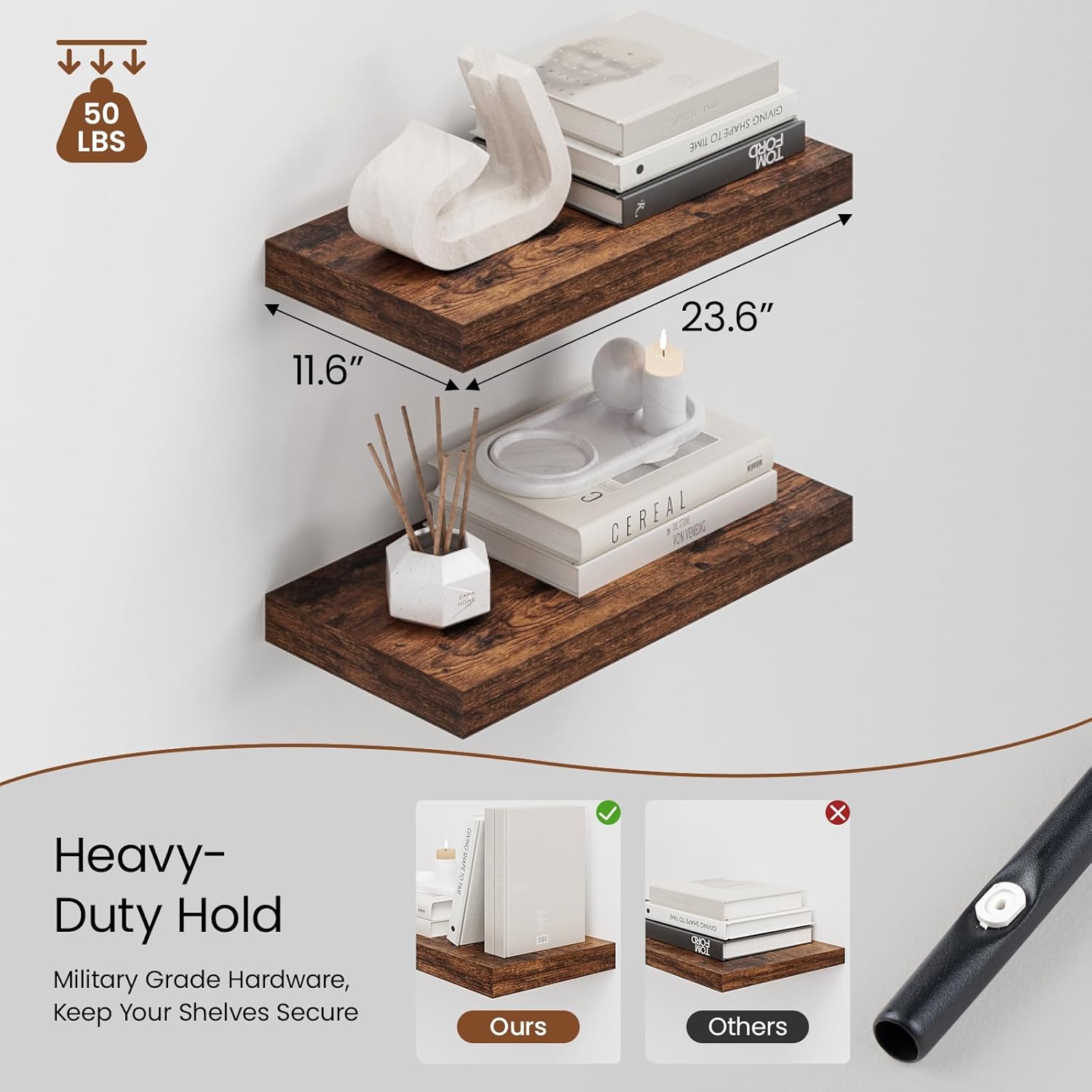 Heimlove 12" Deep Floating Shelves for Wall, 24 Inch Wall Shelf Bathroom Shelves Set of 2, Wall Mounted Shelves for Books Living Room Laundry Room Bedroom Kitchen Home Office, Rustic Brown