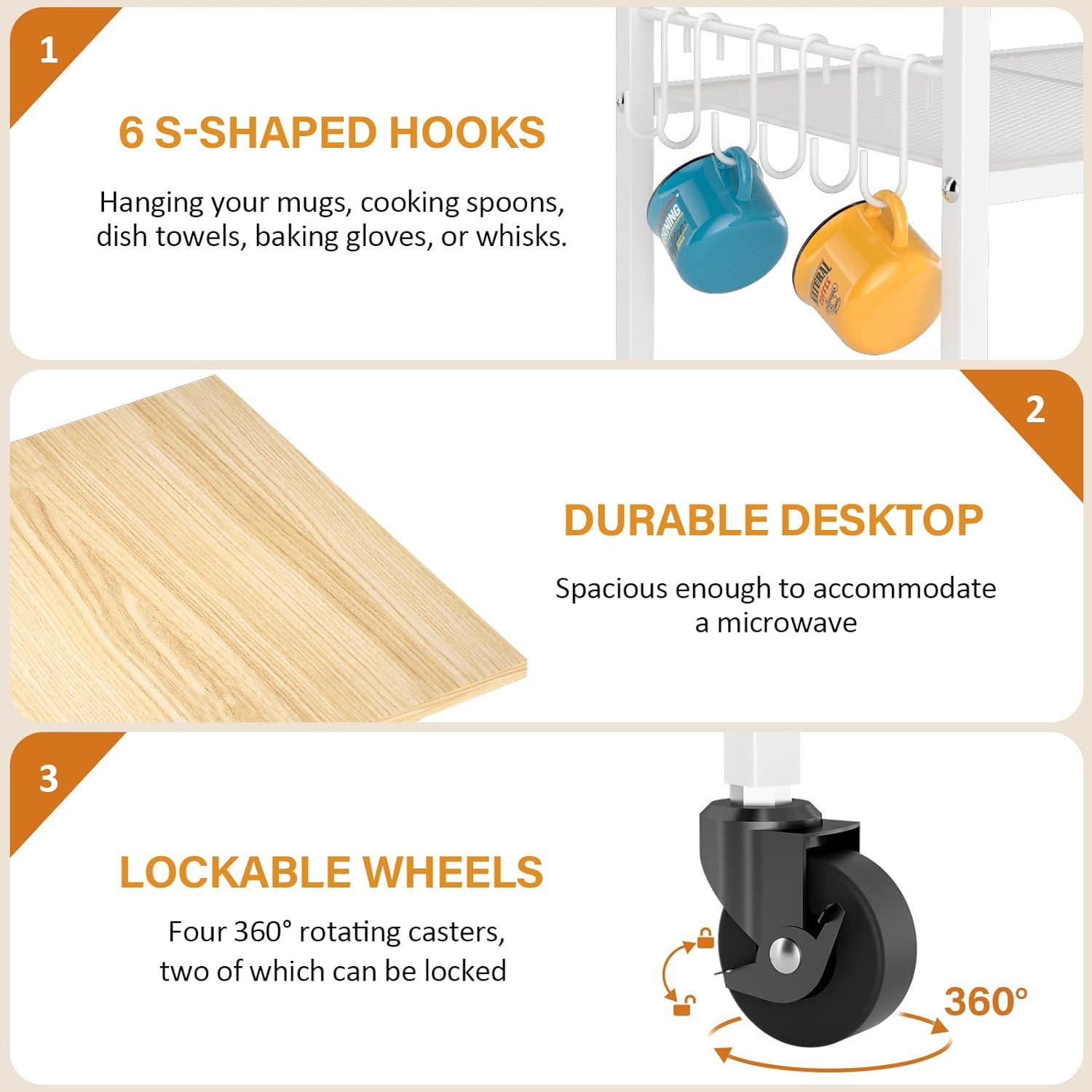 - 【Lockable Wheels & 6 S-Shaped Hooks】Our 3-tier rolling cart features four 360° rotating casters, two of which can be locked to prevent sliding when stationary. It also includes 6 S-shaped hooks, ideal for hanging small utensils like mugs, cooking spoons, dish towels, baking gloves, or whisks.