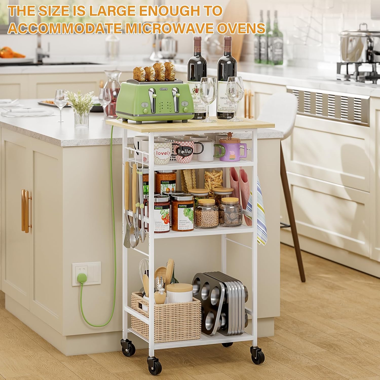 - 【Multifunctional Cart】 Except for being a kitchen microwave stand cart, our storage cart also can be used as bar servicing cart, coffee cart, drink cart, office printer stand, standing shelf for the balcony. This versatile cart can be placed in various settings, including your entryway, kitchen, living room, balcony, or office, adding both functionality and style to your space.
