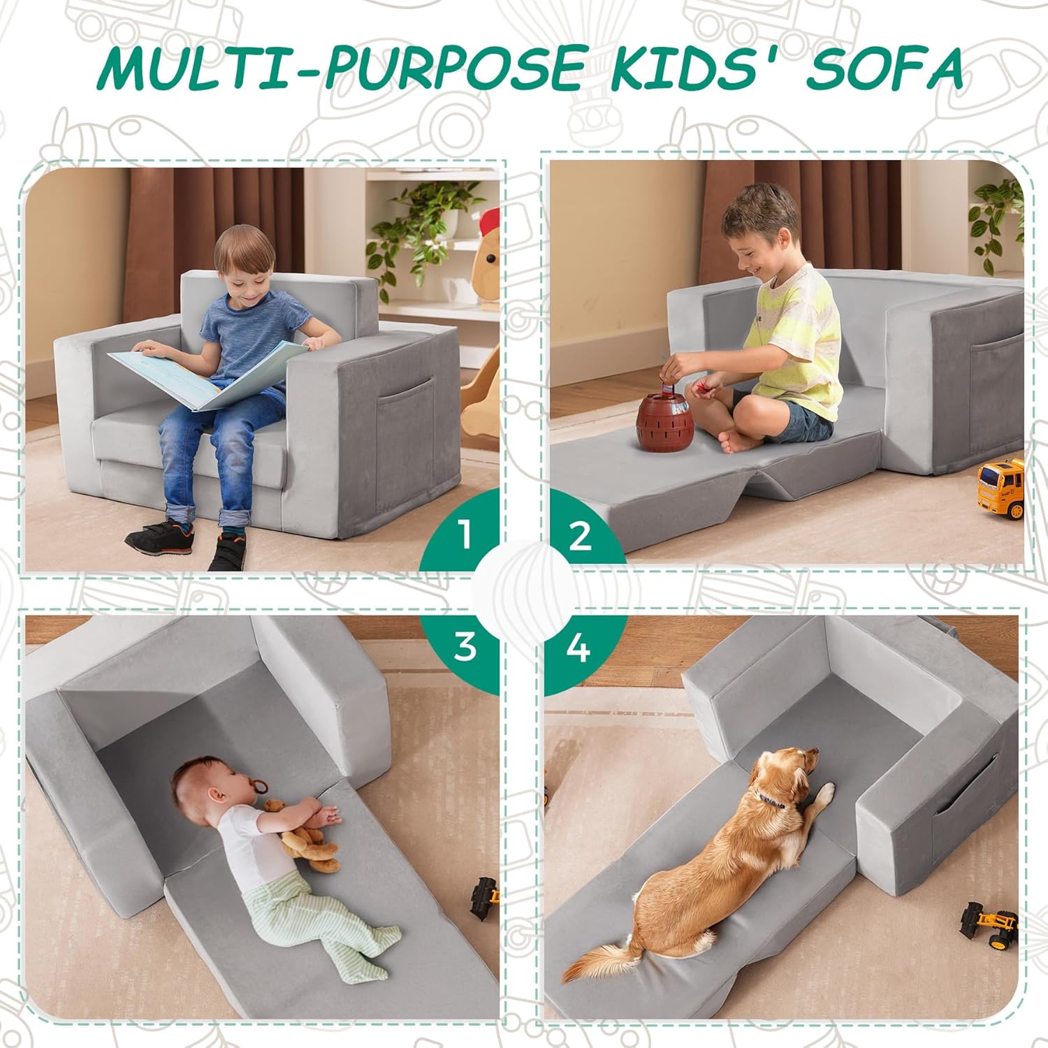 Kids Couch, 2-in-1 Toddler Chair Comfy 1-3 Years Old, Convertible Kids Chair, Toddler Couch That Fold Out, Kid Lounge Chairs for Boys and Girls, Soft Coral Fleece, Grey