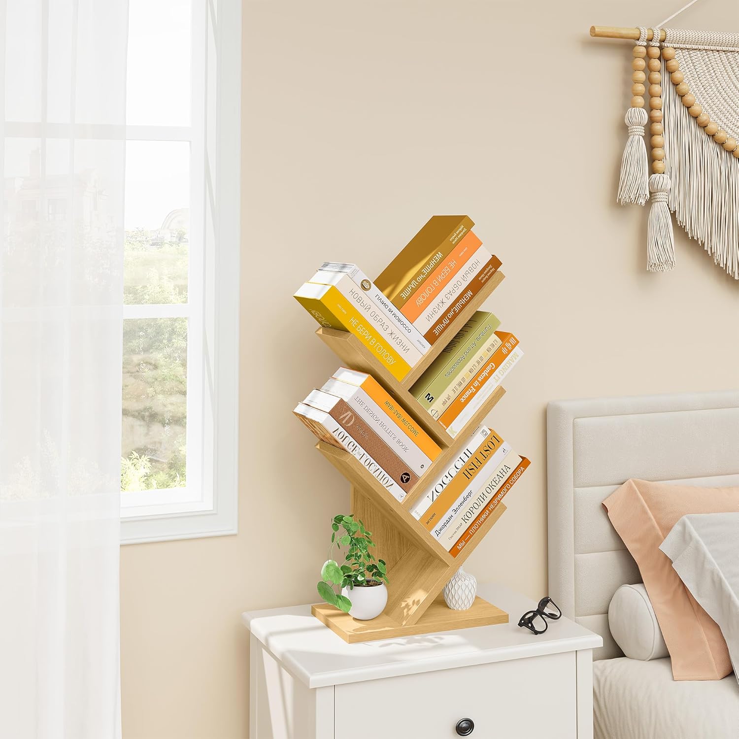 - 【Space Saving & Large Capacity】 Hoctieon 4 tier bookshelf dimensions are 11.8"L x 7.1"W x 24"H. It's very compact with 4 open shelves, ideal for storing books, potted plants, CDs, magazines, videos, photo albums, crafts, or other favorite collections. This tree-shaped bookshelf takes up very little floor space. It is the ideal bookshelf for corners and small spaces.