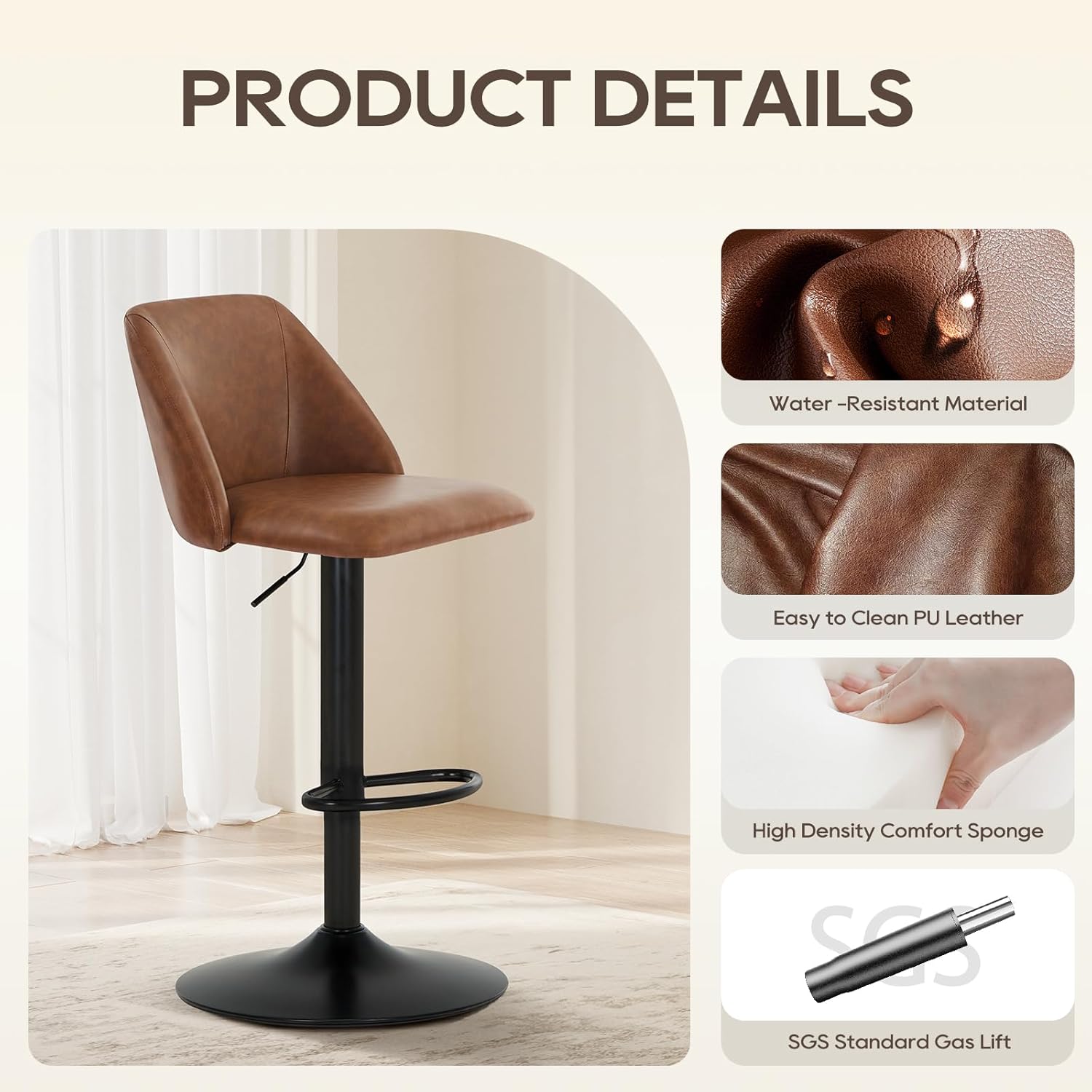 - Durable, Stylish & Comfortable Seating: Built on a sturdy 17.72" diameter base that supports up to 250 lbs, these modern bar chairs offer exceptional stability and durability without sacrificing style. The breathable PU leather upholstery, paired with high-density sponge foam padding, ensures long-lasting comfort and a refined look—perfect for both high-traffic spaces and elegant home settings.