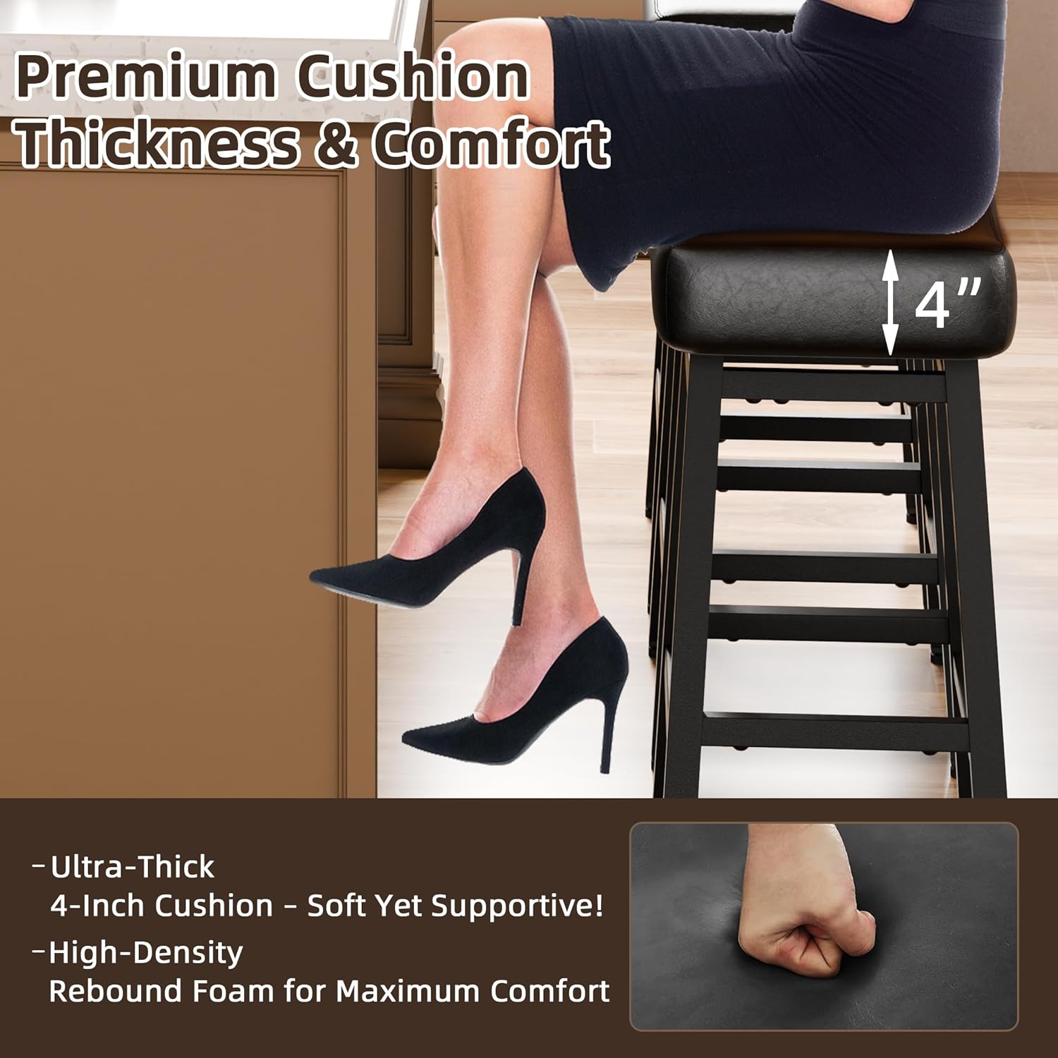 - Engineered for Comfort, Built for Daily Life: 4-inch premium foam cushion molds to your body like a comforting sofa. Ergonomic saddle counter height bar stools seat design reduces pressure points - well-suited for long chats over coffee or family pizza nights. Space-smart silhouette slides completely under counters (fits in 10" clearance). PRO TIP: Practical bar stools for kitchen islands and apartments - a barstool set of 2 takes less floor space than an armchair.