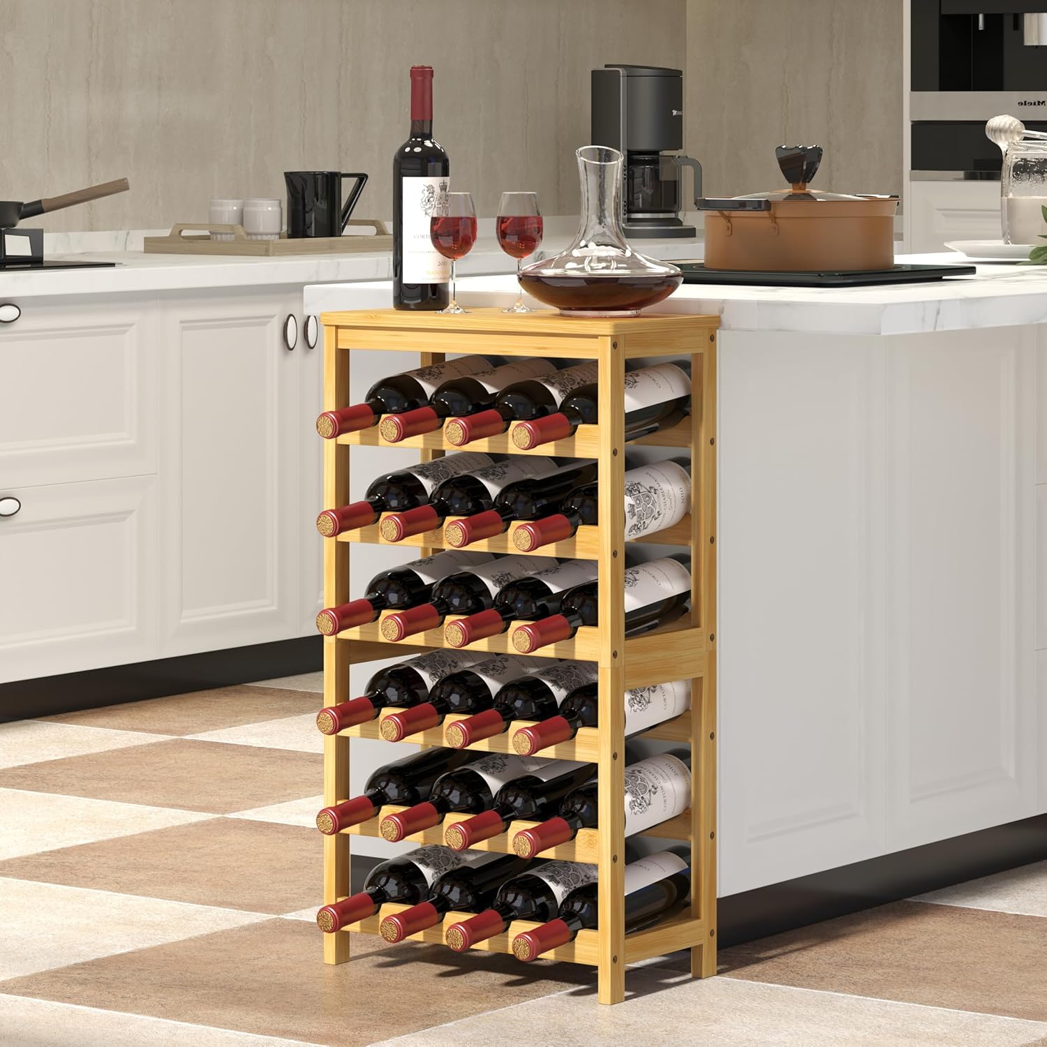 - ššš«š š ššš©ššš¢šš²: Measuring 9.5"D x 16.1"L x 32.3"H and with 4 bottles on each shelf, this elegant 6-tier bamboo wine rack effortlessly accommodates a total of 24 standard wine bottles. Ideal for organizing and storing both white and red wines efficiently.