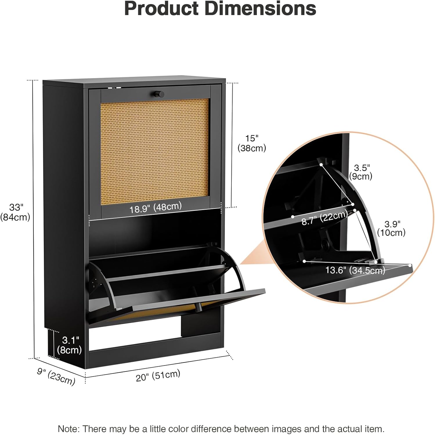 Rattan Shoe Cabinet for Entryway Slim, Entrance Shoe Cabinet with Flip Drawers Narrow, 2 Tier Hidden Shoe Organizer for Foyer, Dorm, Small Space, Black