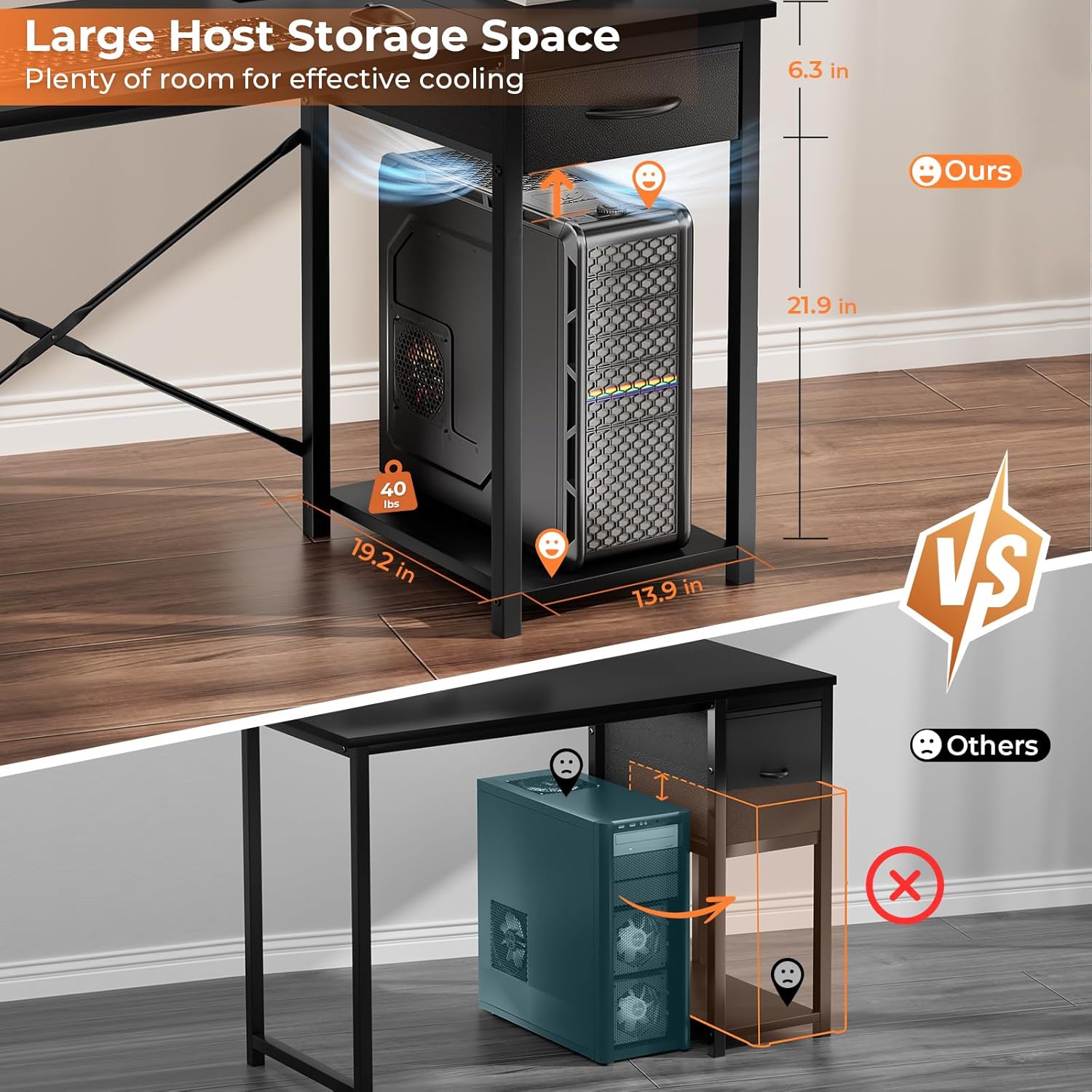 - Computer Tower Compatibility Space: The storage space under the drawer measures 19.2(L) x 13.9(W) x 21.9(H) inches and can withstand 40 pounds. It is sturdy, stable, and spacious, suitable for 95% of mid tower and partially full tower situations