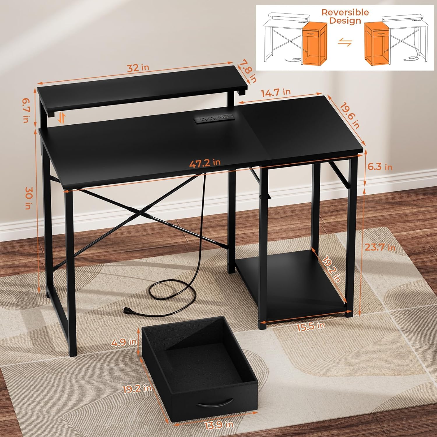 - Special Feature : Adjustable Monitor Stand, Built-In USB Outlet, Fabric Drawer, Reversible
