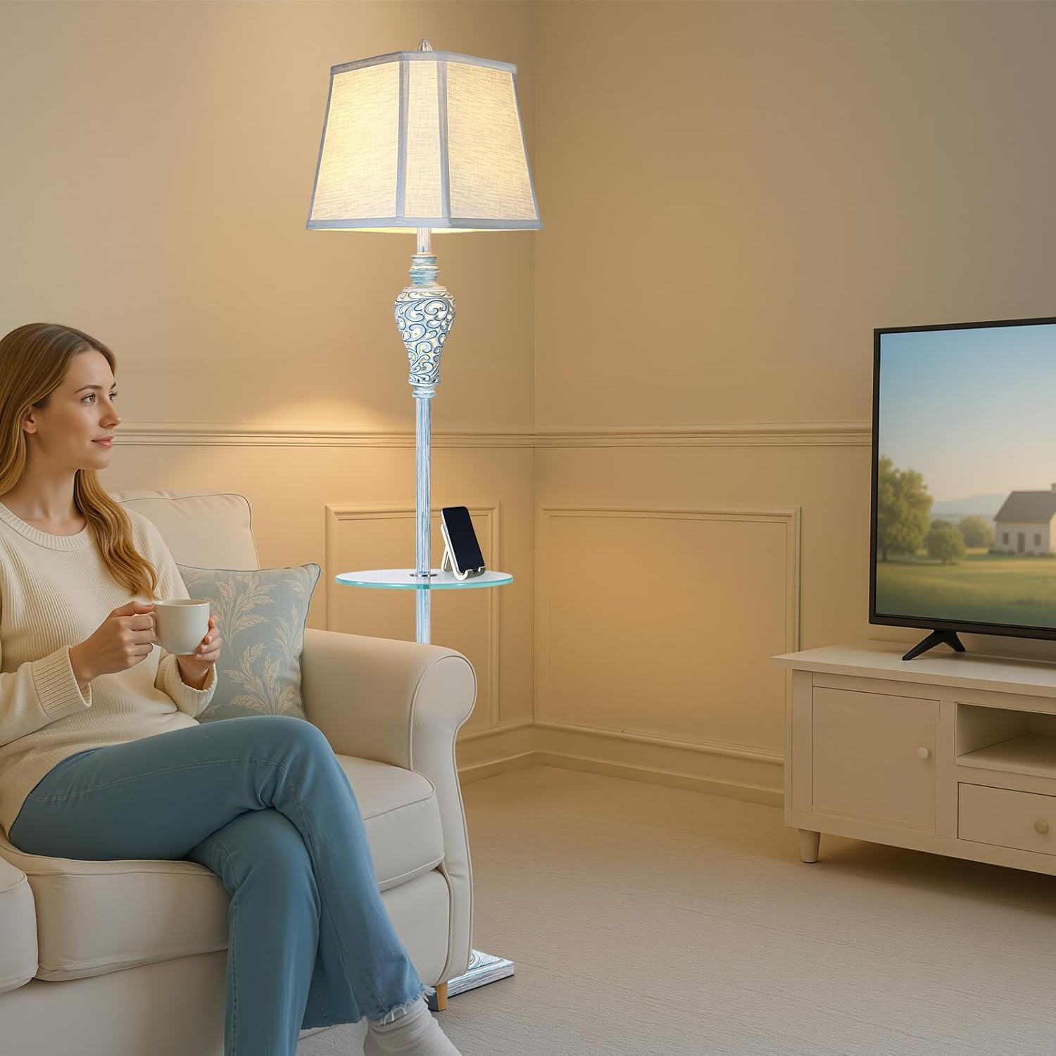 - STURDY GLASS TRAY: More than just a lamp, this farmhouse floor lamp comes with a 12" tempered glass tray table that sits 27.5" off the ground. It can be used as a small nightstand to place your morning coffee, bedtime reading, phone or other items.