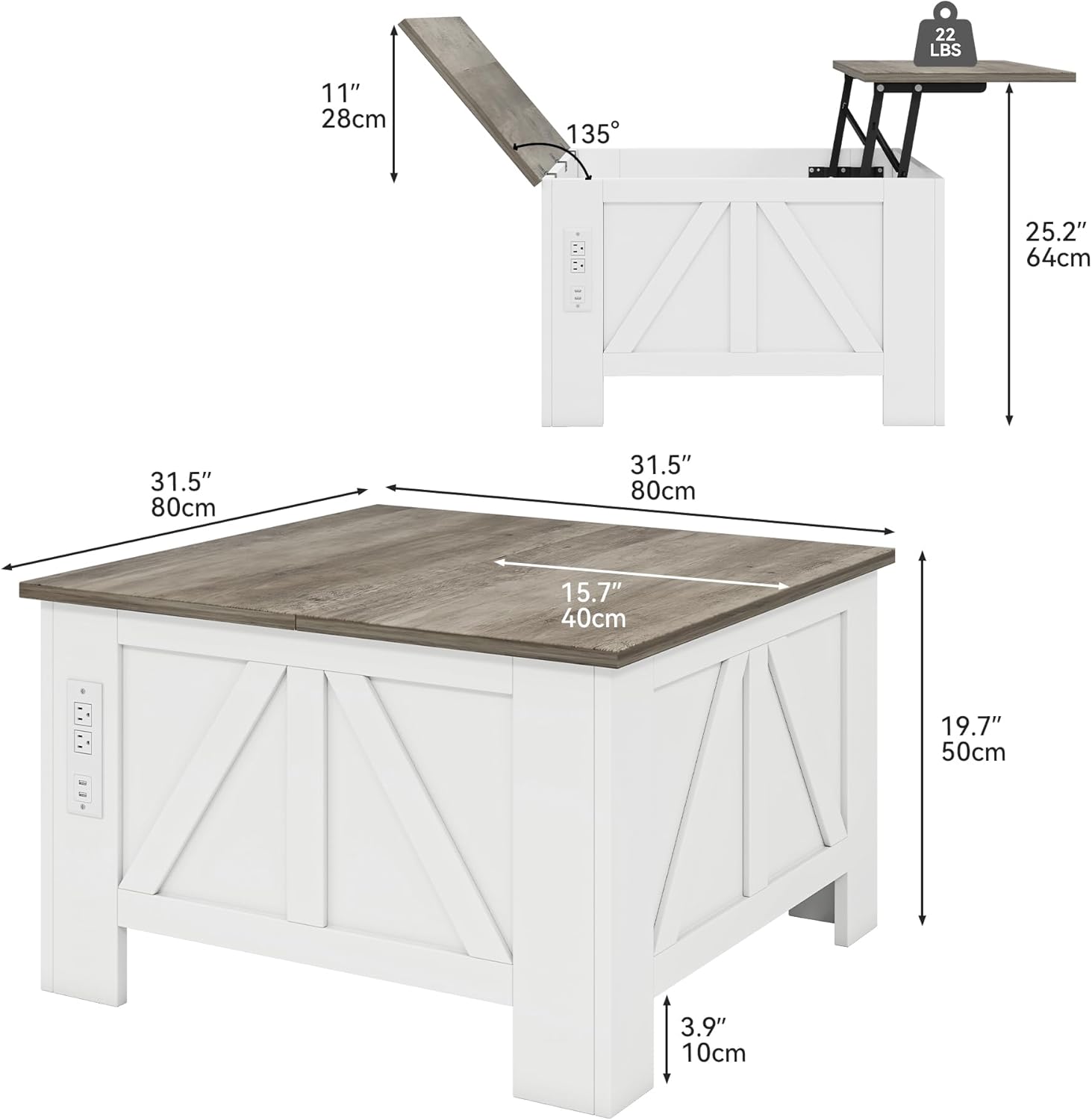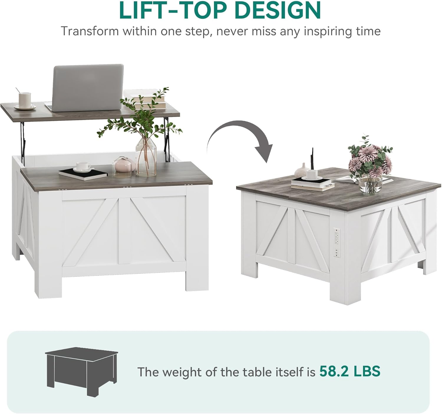 - Coffee Table with Lifting Top: The white wooden coffee table experiences smooth and safe lifting with a lifting mechanism featuring struts. It can be lifted to a height of 25.2 inches from the ground for convenient office work. The flip design on the other side provides convenient storage and collecting blankets, and other items in the living room.