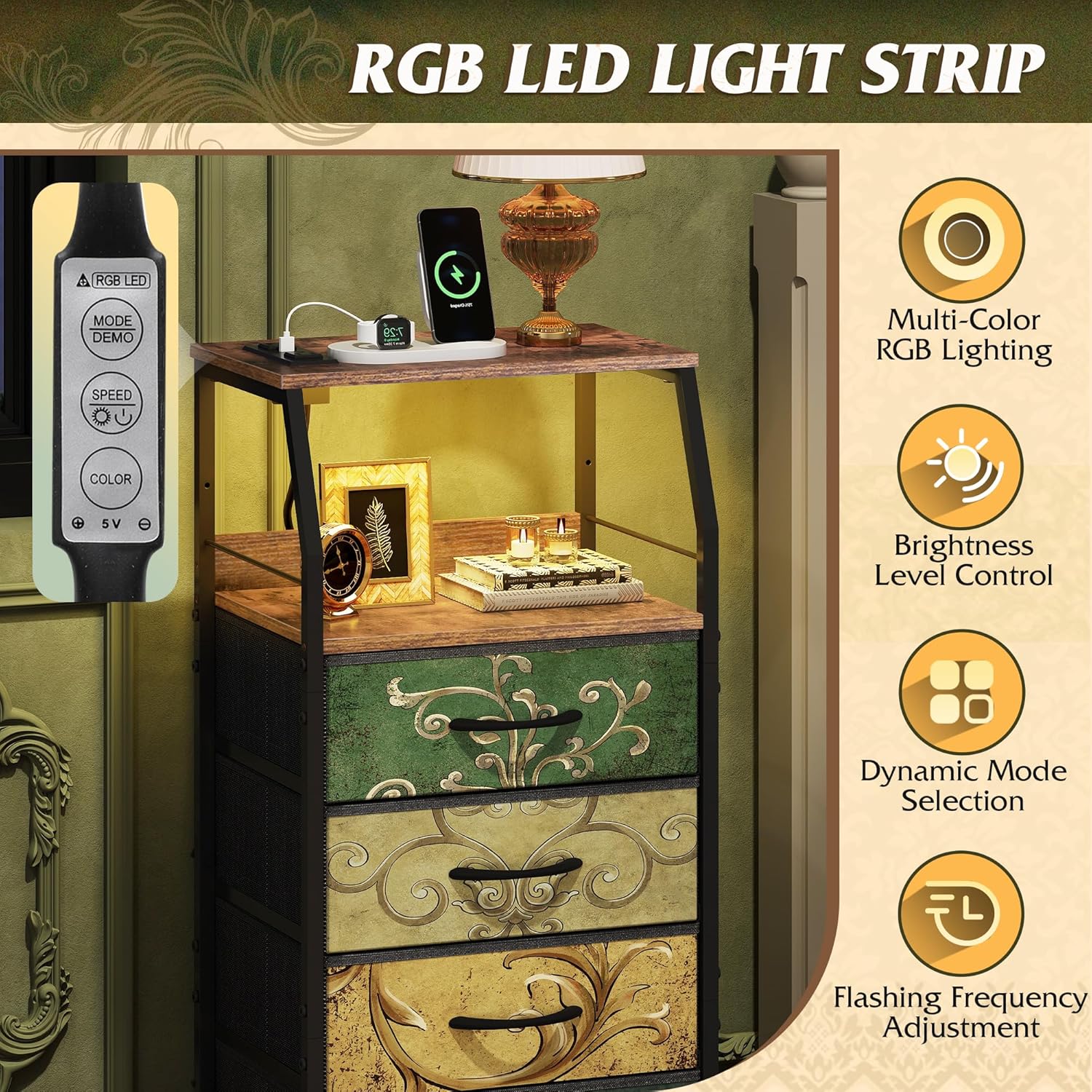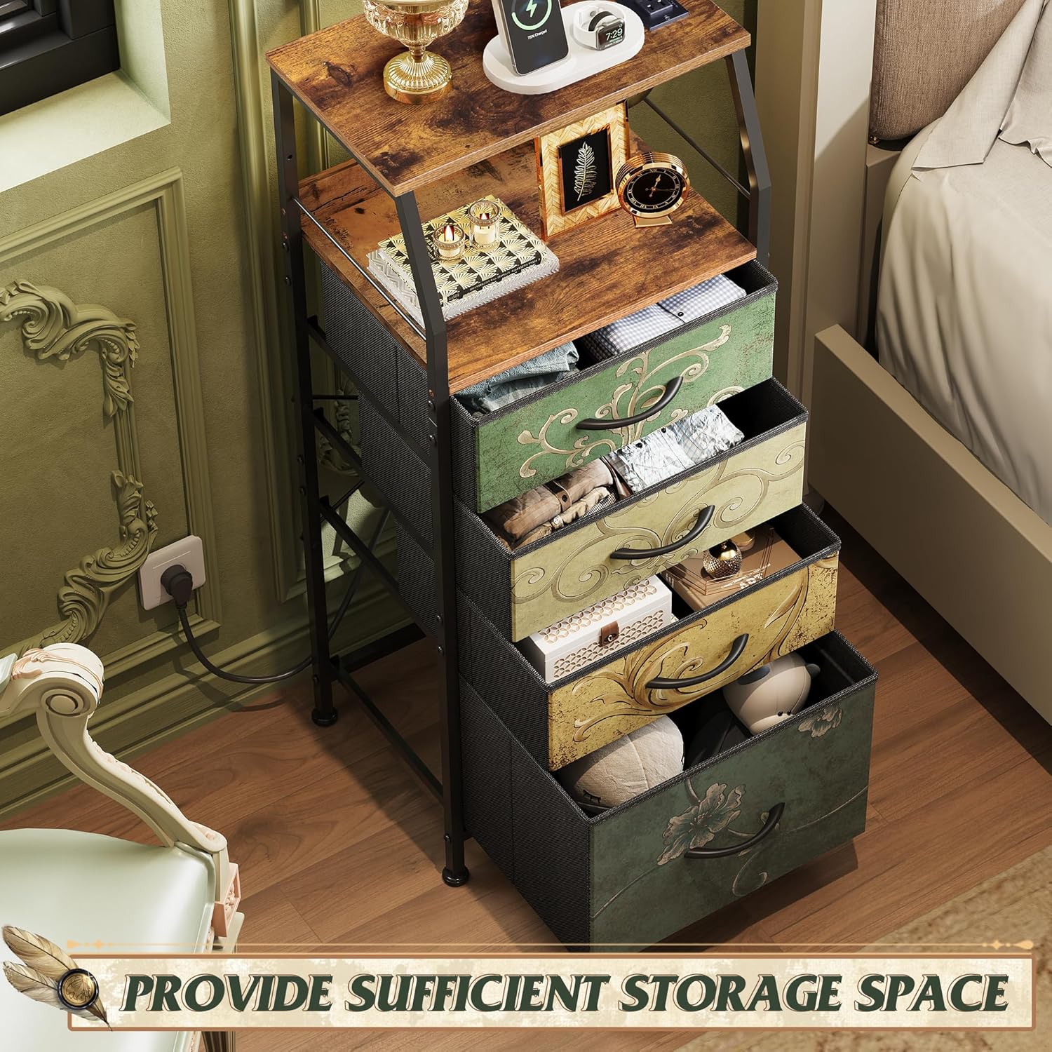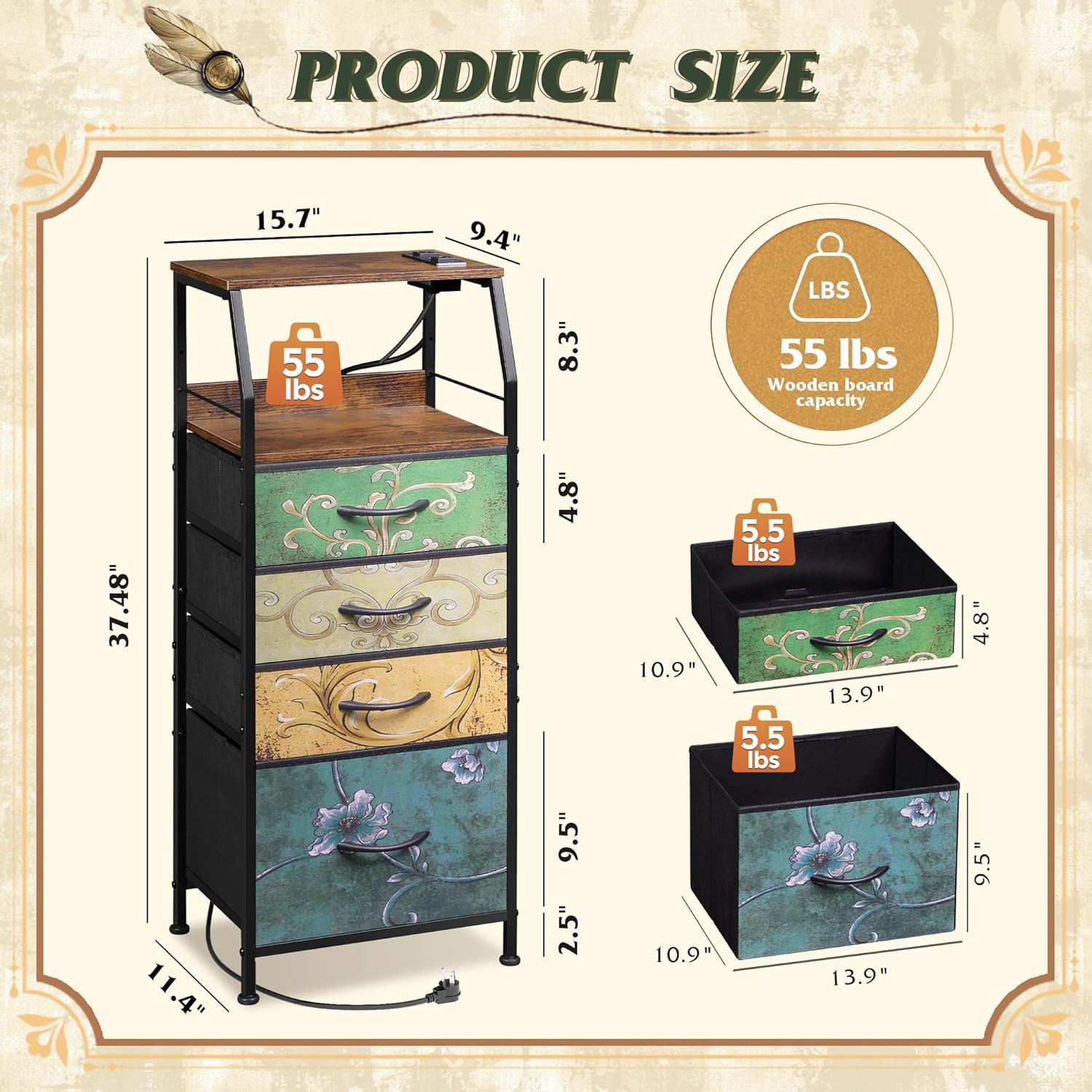 WLIVE 4 Drawer Dresser for Bedroom, 37" H Nightstand with Charging Station and Led Light, Tall Night Stand Bed Side Table, End Table with USB Ports and Outlets, Fabric Bins, Floral Painted