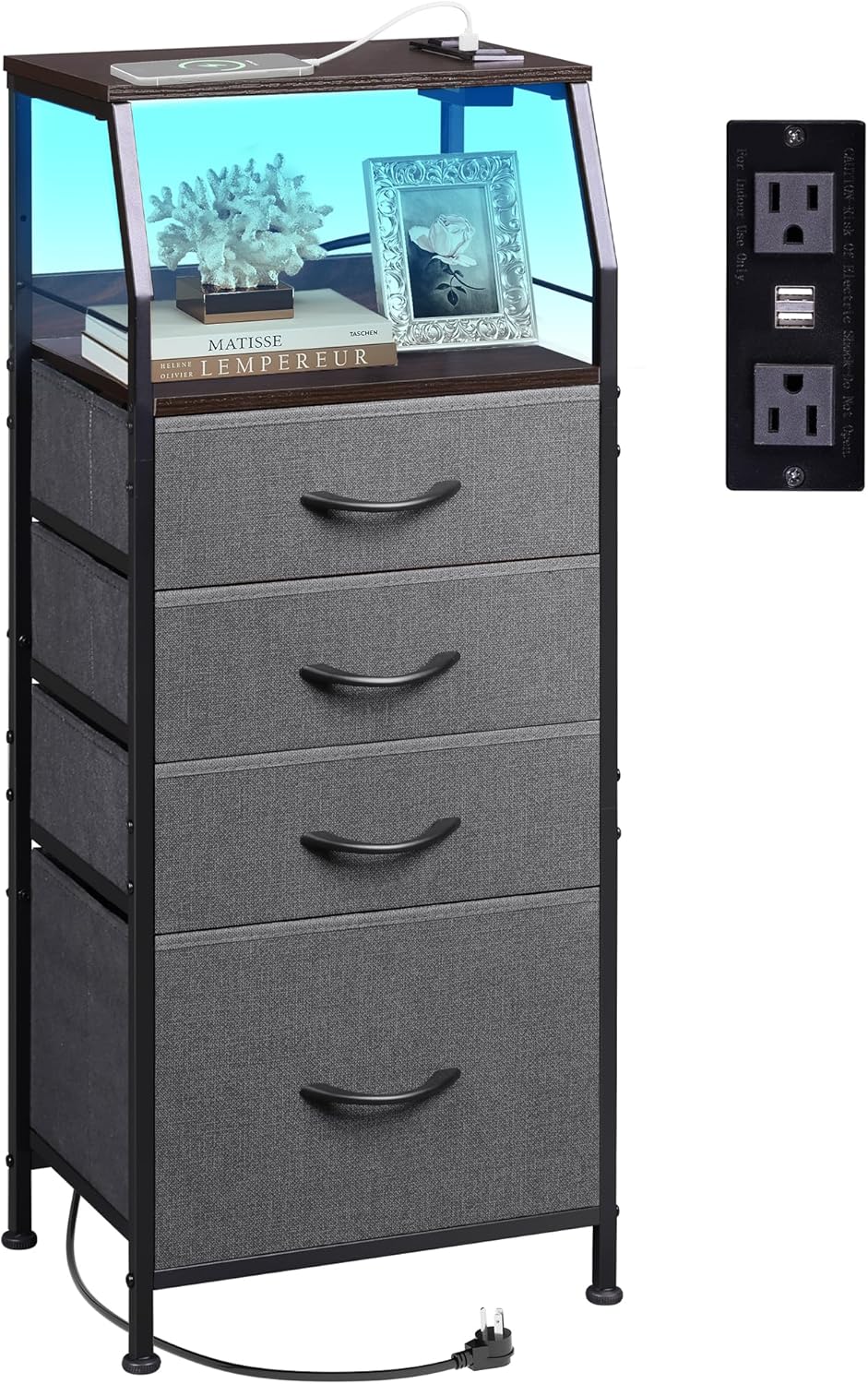 WLIVE Nightstand with Charging Station, Night Stand with LED Light, Tall 4 Drawer Dresser for Bedroom, 37" H Bedside Table with Fabric Storage Bins, Open Wood Shelf, Metal Frame, Dark Grey