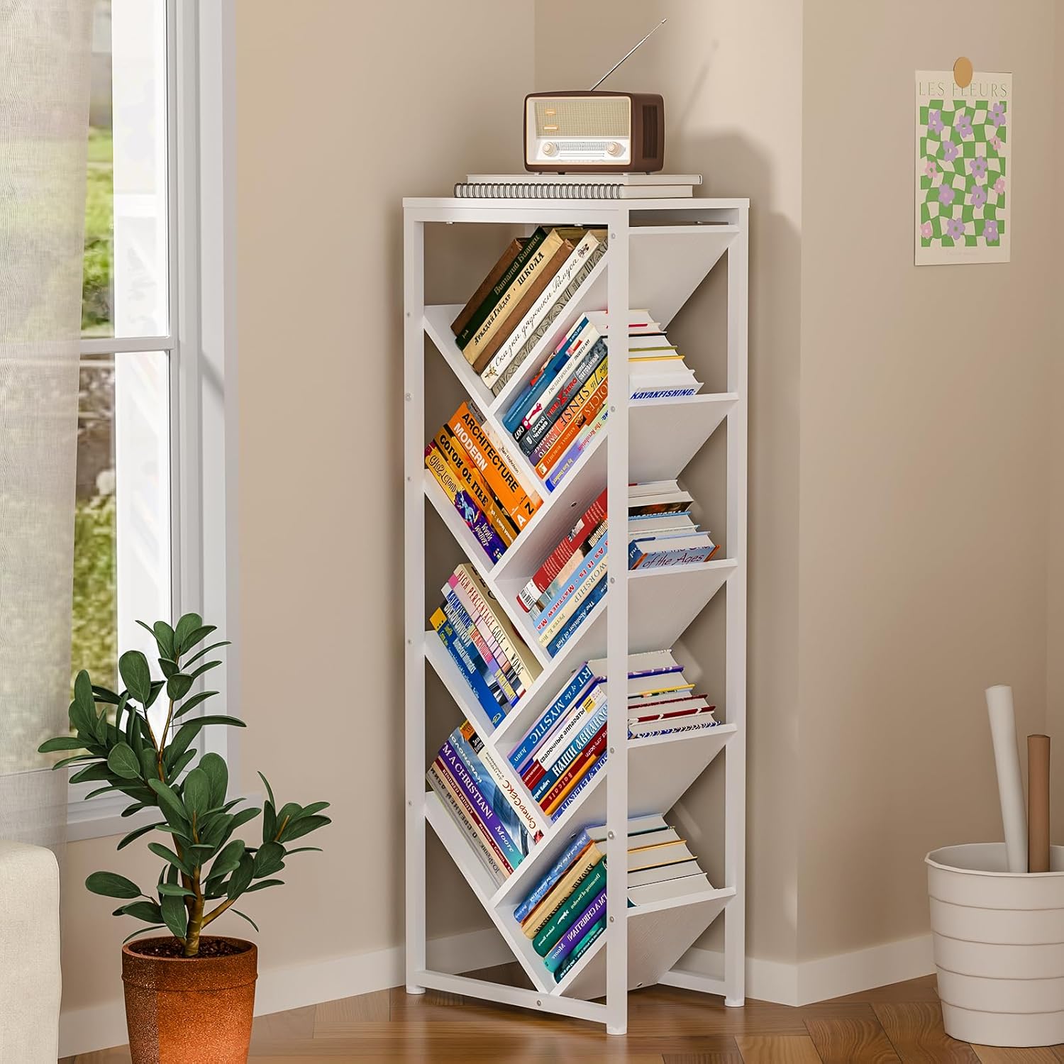 9 Tier Tree Bookshelf - White Book Shelf Floor Standing Modern Bookcase for Hardcover Books, Small Bookshelf for Small Spaces Bookshelves Wooden Book Storage Organizer Shelves for Bedroom Living Room
