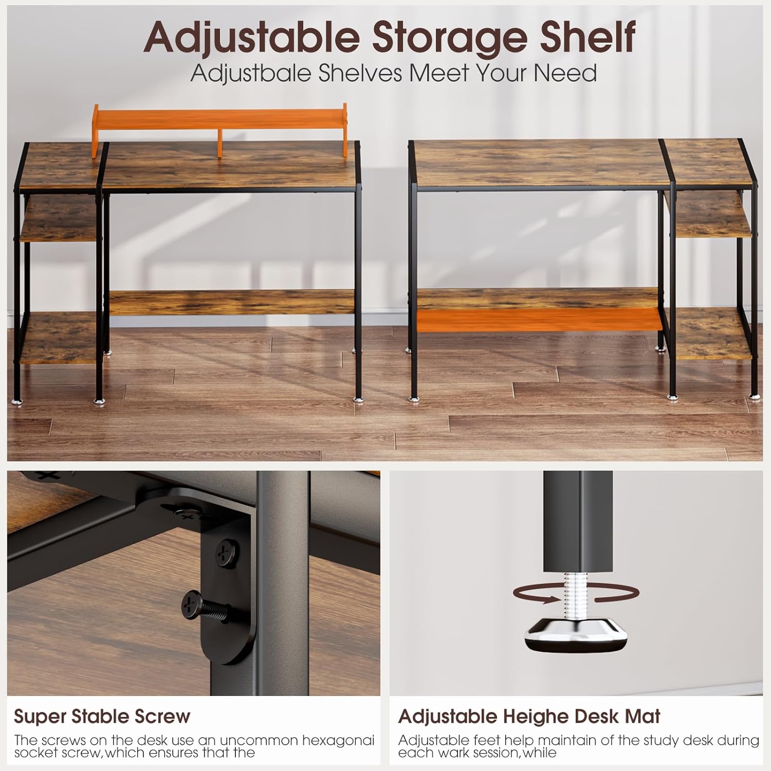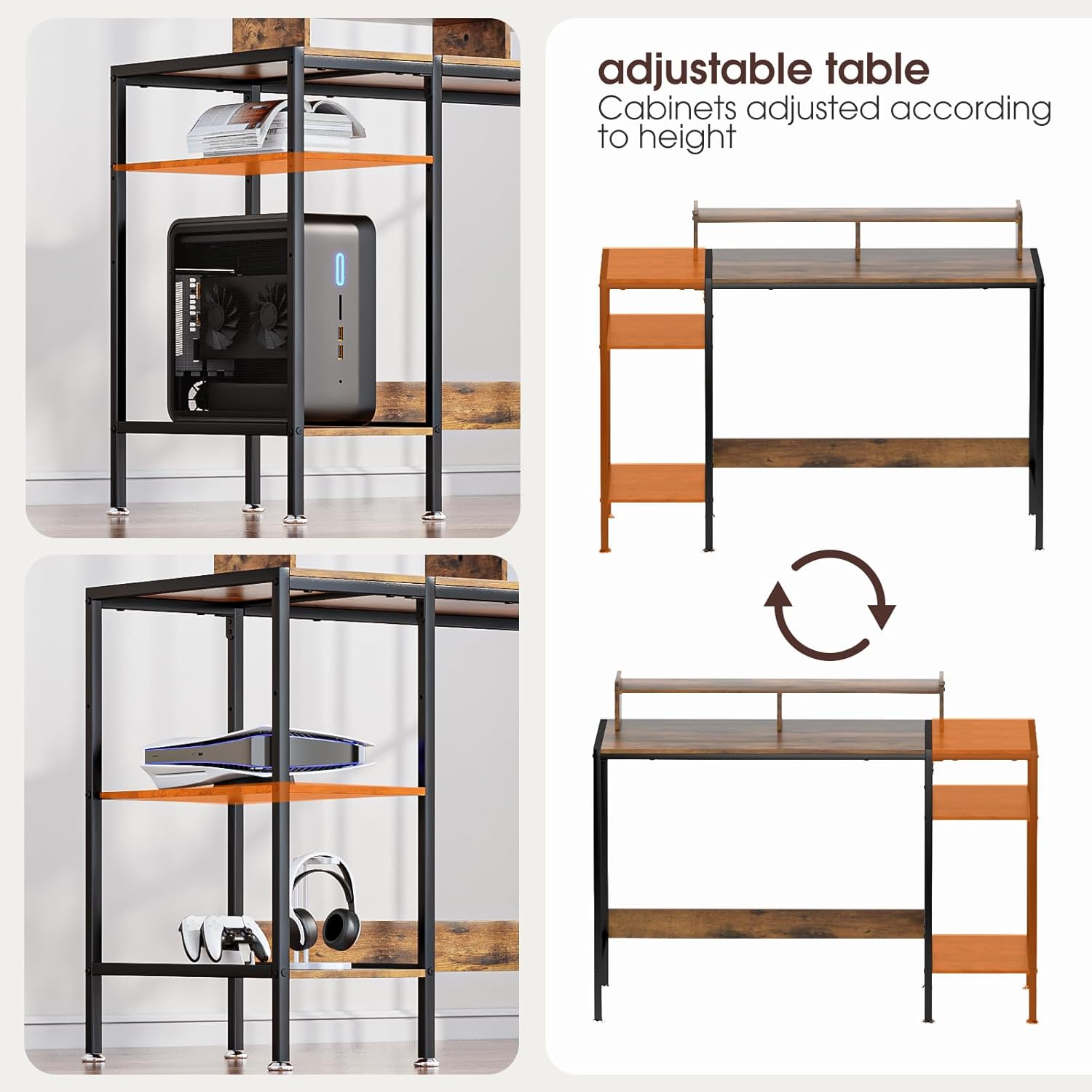 - 【Adjustable Storage Space】The open storage rack of the computer desk has an adjustable internal height, greatly increasing storage space and making it perfect for storing your office, study, gaming and other supplies. Not only does it have a large storage space, but it can also change styles. This modern office desk equipped with a monitor stand, storage function, practical, sturdy, and affordable is exactly what you need