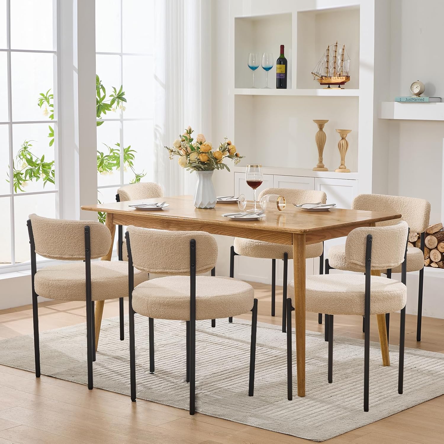 Dining Chairs Set of 6, Beige Boucle Dining Chair, Curved Backrest Upholstered Dining Room Chairs with Black Metal Legs, Mid Century Modern Dining Chairs for Kitchen, Living Room, Beige