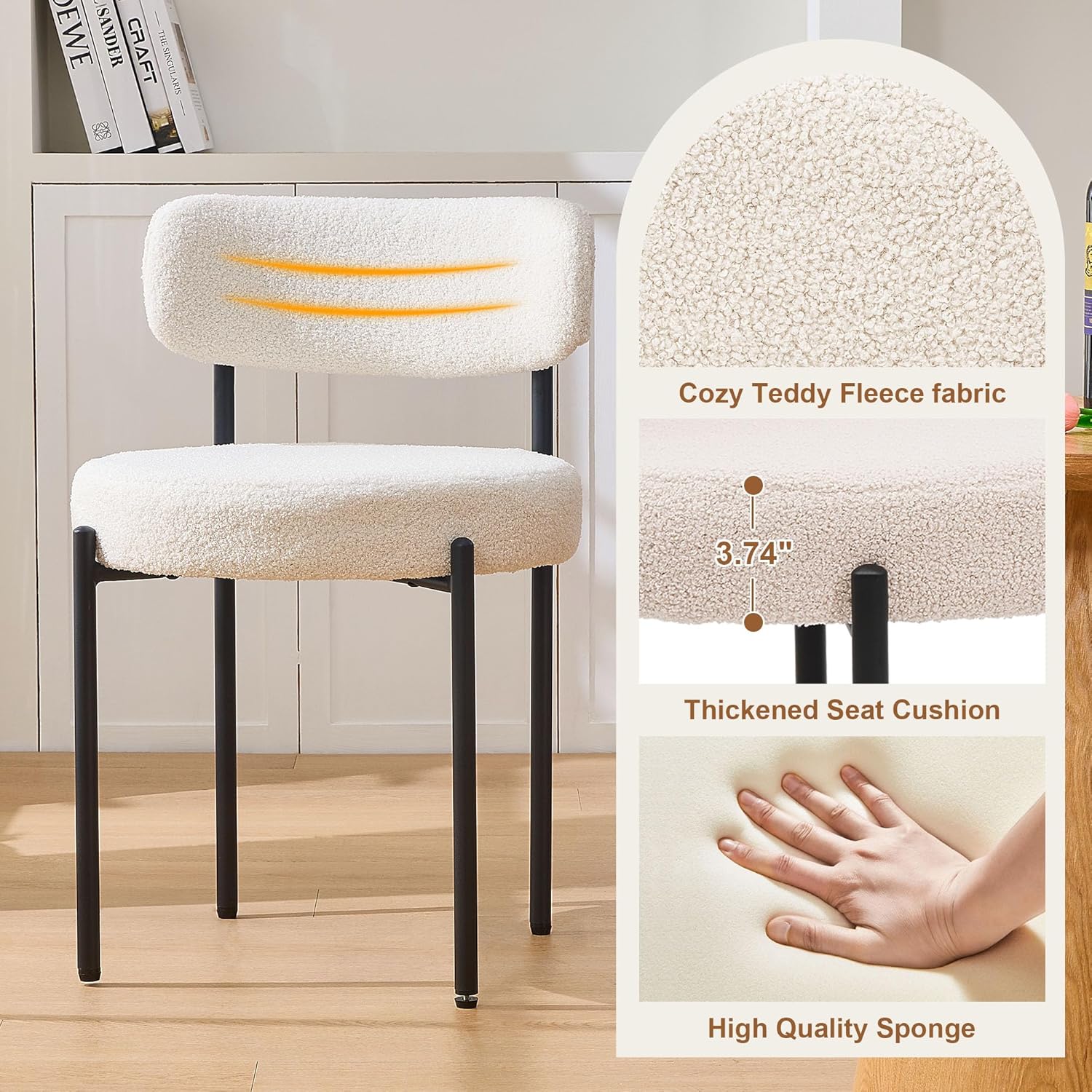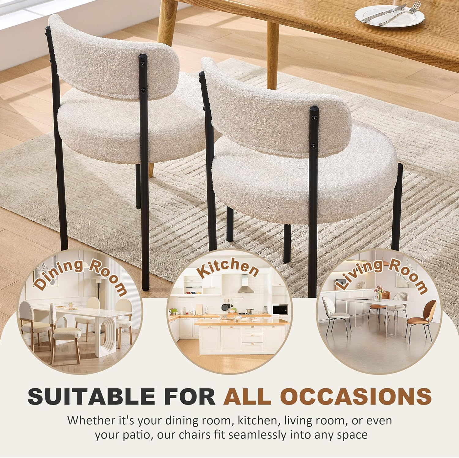 Dining Chairs Set of 6, White Boucle Dining Chair, Curved Backrest Upholstered Dining Room Chairs with Black Metal Legs, Mid Century Modern Dining Chairs for Kitchen, Living Room, White