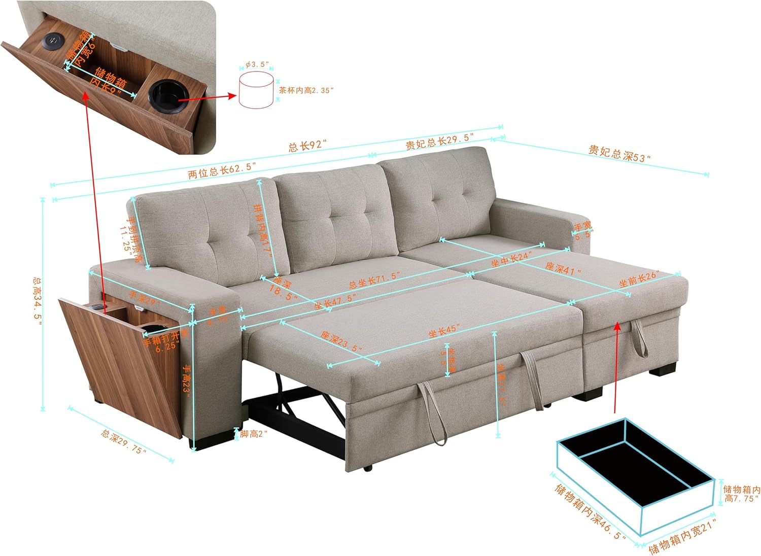 - Size : Linen Sectional Sofa with Storage