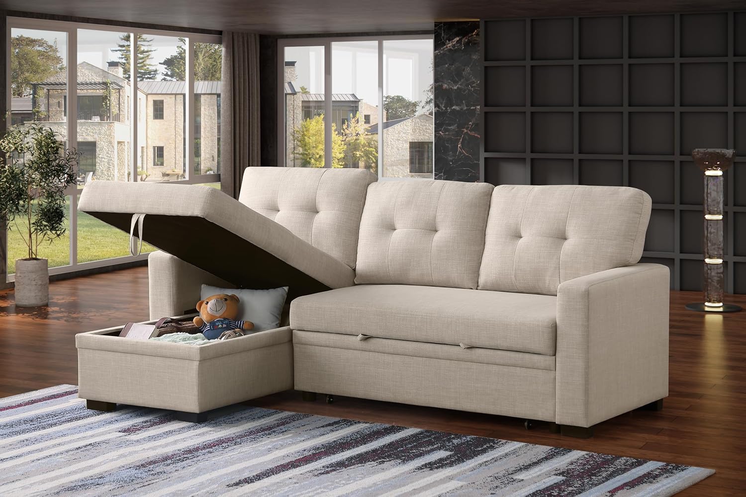 Devion Furniture Garisa 4-in-1 Convertible L Shaped Couch with Pull Out Bed and Storage, Sectional Sleeper Sofa with Reversible Chaise for Living Room, Apartment, Bedroom, Office