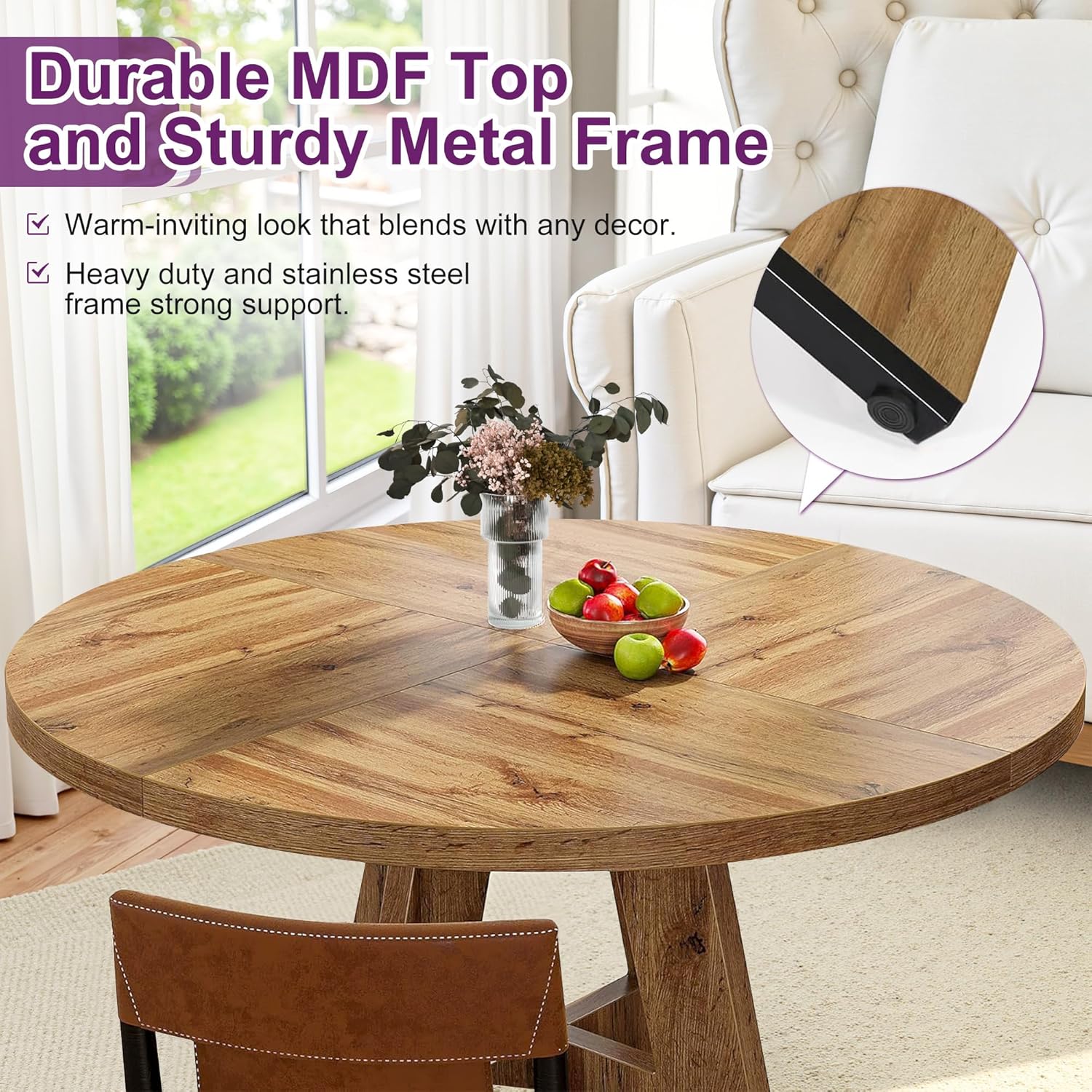 - [Modern Farmhouse Elegance]: Featuring a sleek brown finish, this round dining table blends classic farmhouse charm with a contemporary touch, making it a stylish centerpiece for any dining space.