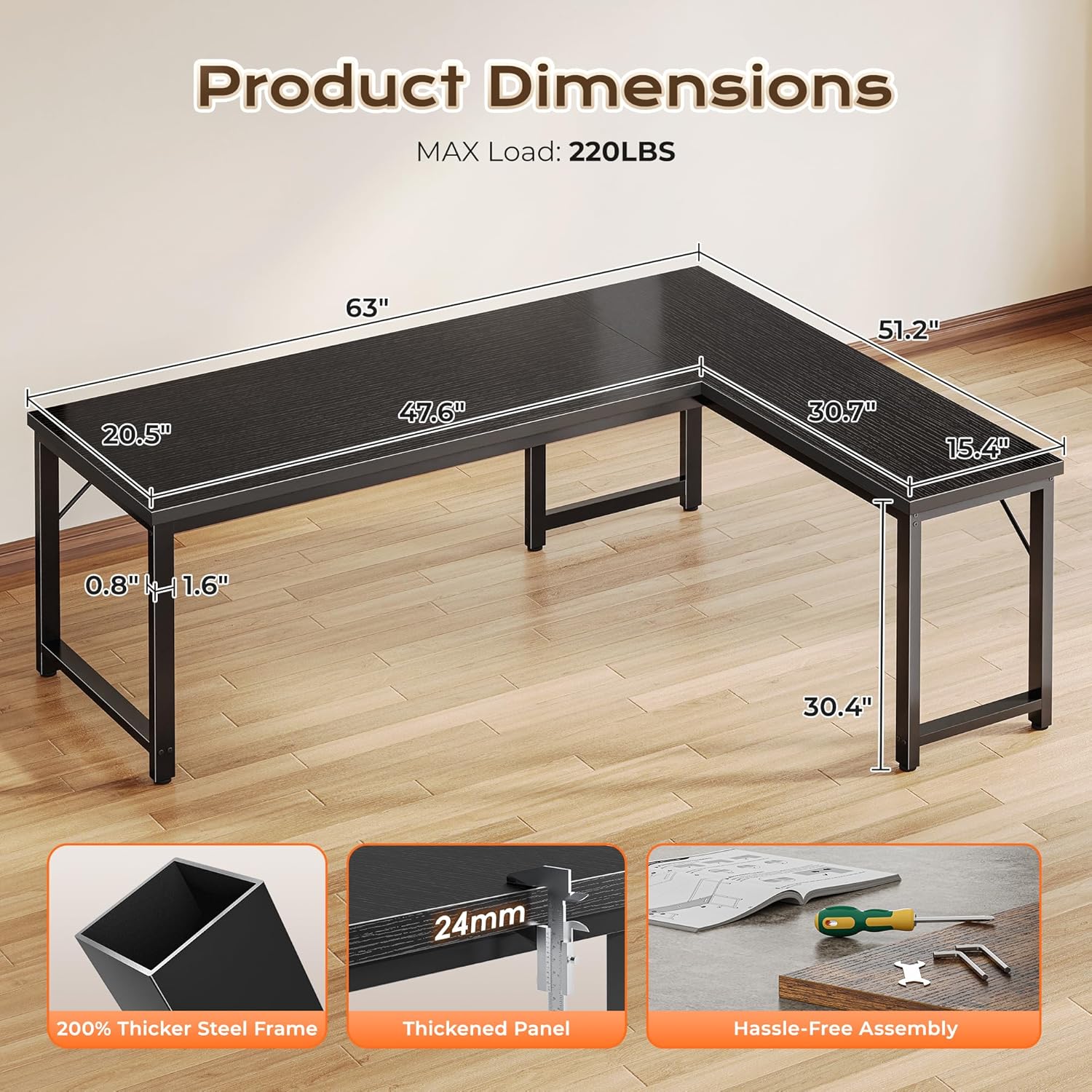 - 【Thicker Desktop & Heavy Workloads】From paperwork to creative projects, this 0.95 inches thick, high-density desktop l shaped office desk gives you the sturdy, scratch-resistant, waterproof surface and 220 lbs weight capacity you need to focus and get things done. Plenty of space for multiple monitors, notebooks, and that much-needed coffee