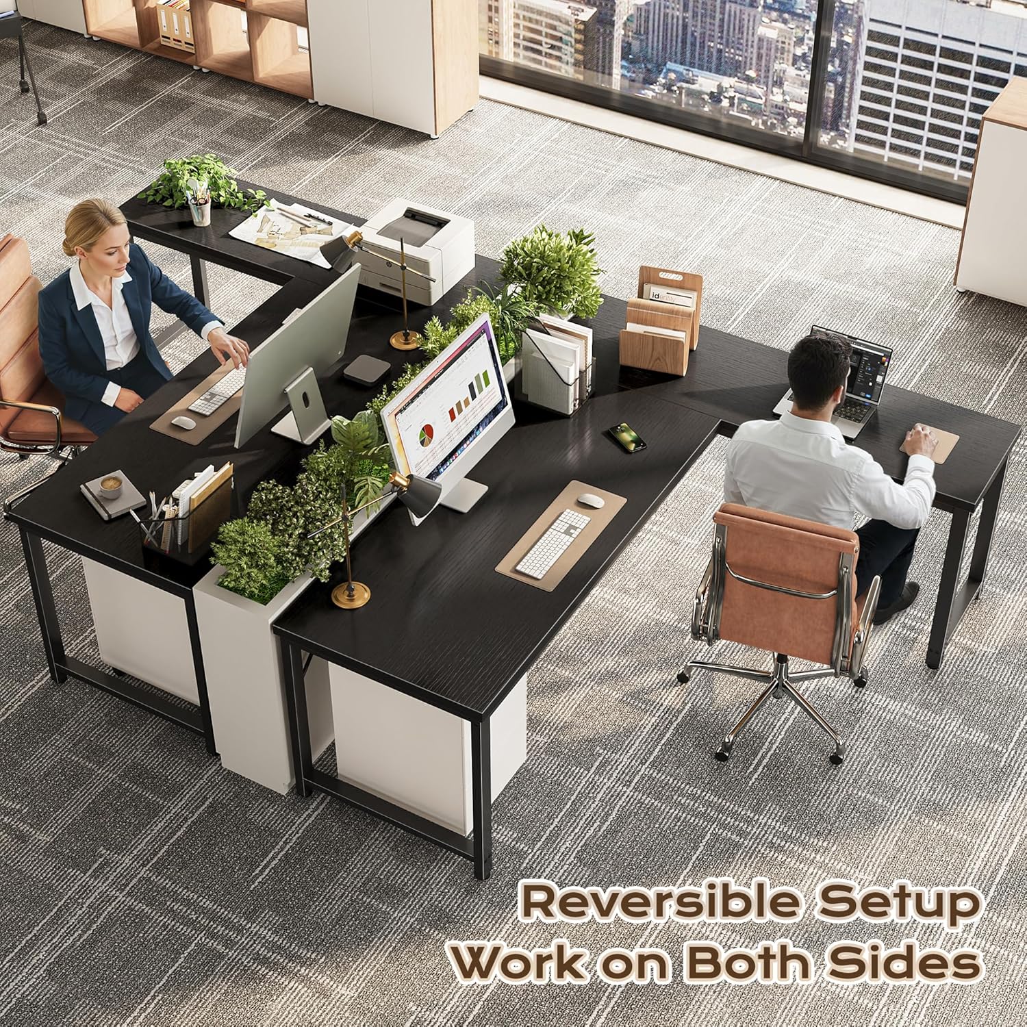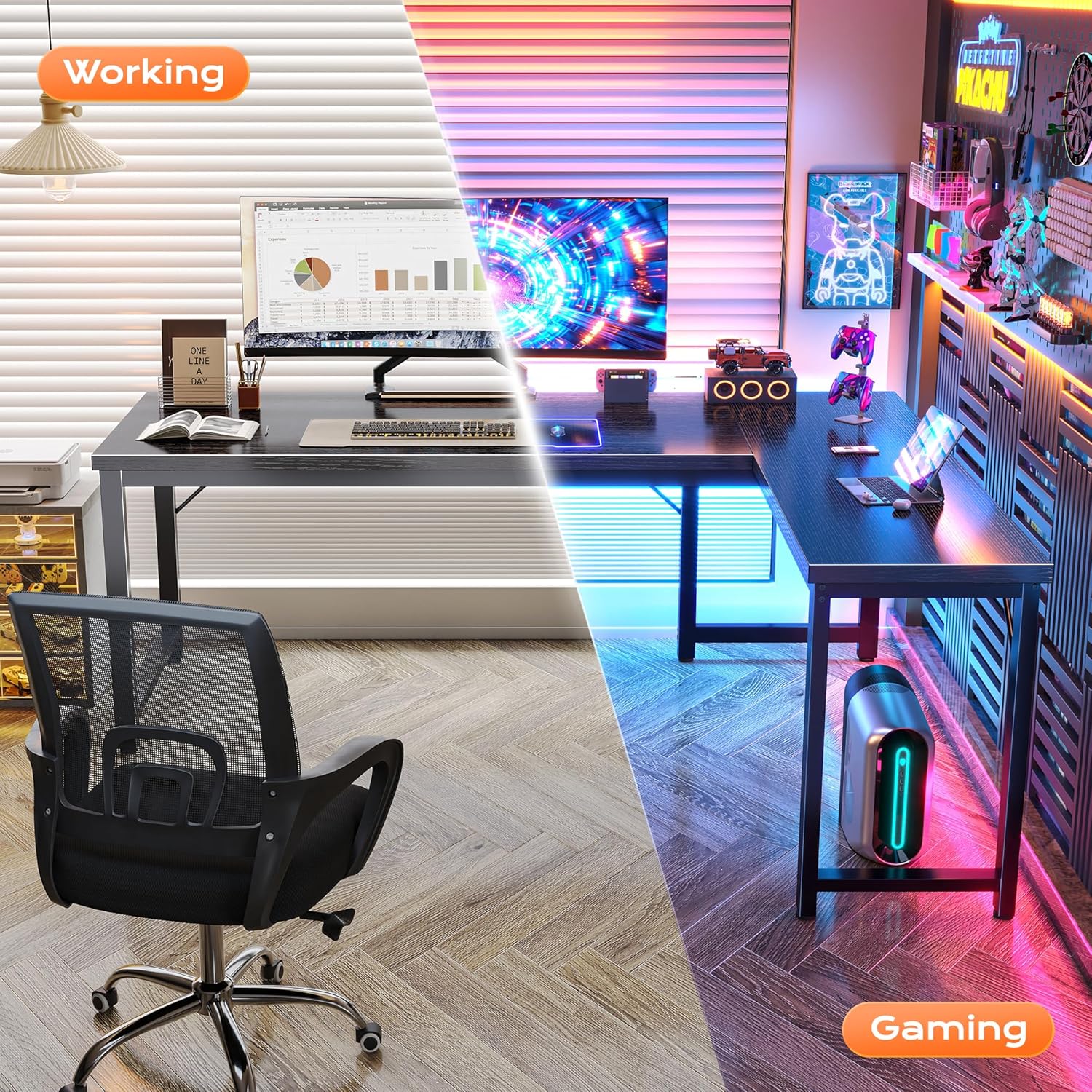 - 【Reversible L Shaped Computer Desk】Need more space? This reversible l desk can be tucked neatly into a corner or reversed to fit your home layout. Got a work buddy? Combine 2 pc desks for a seamless 2-person workstation. Plus, the L-shape gives your elbows proper support and extra room for monitors, notebooks, and, of course, coffee