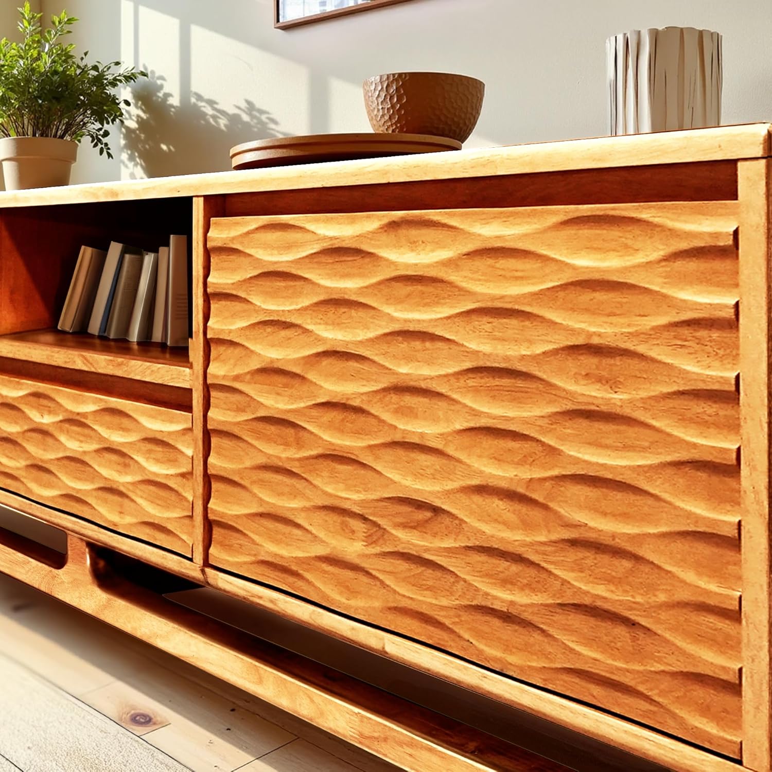 - CELEBRATE NATURE’S MASTERPIECE: Elara TV stand showcases the unparalleled beauty of solid Hevea wood, with its striking grain patterns and deep, natural tones enhanced by mesmerizing intricate details. Its perfect size fits all TV sizes up to 80 inch and offers ample space for decorations and personal touches