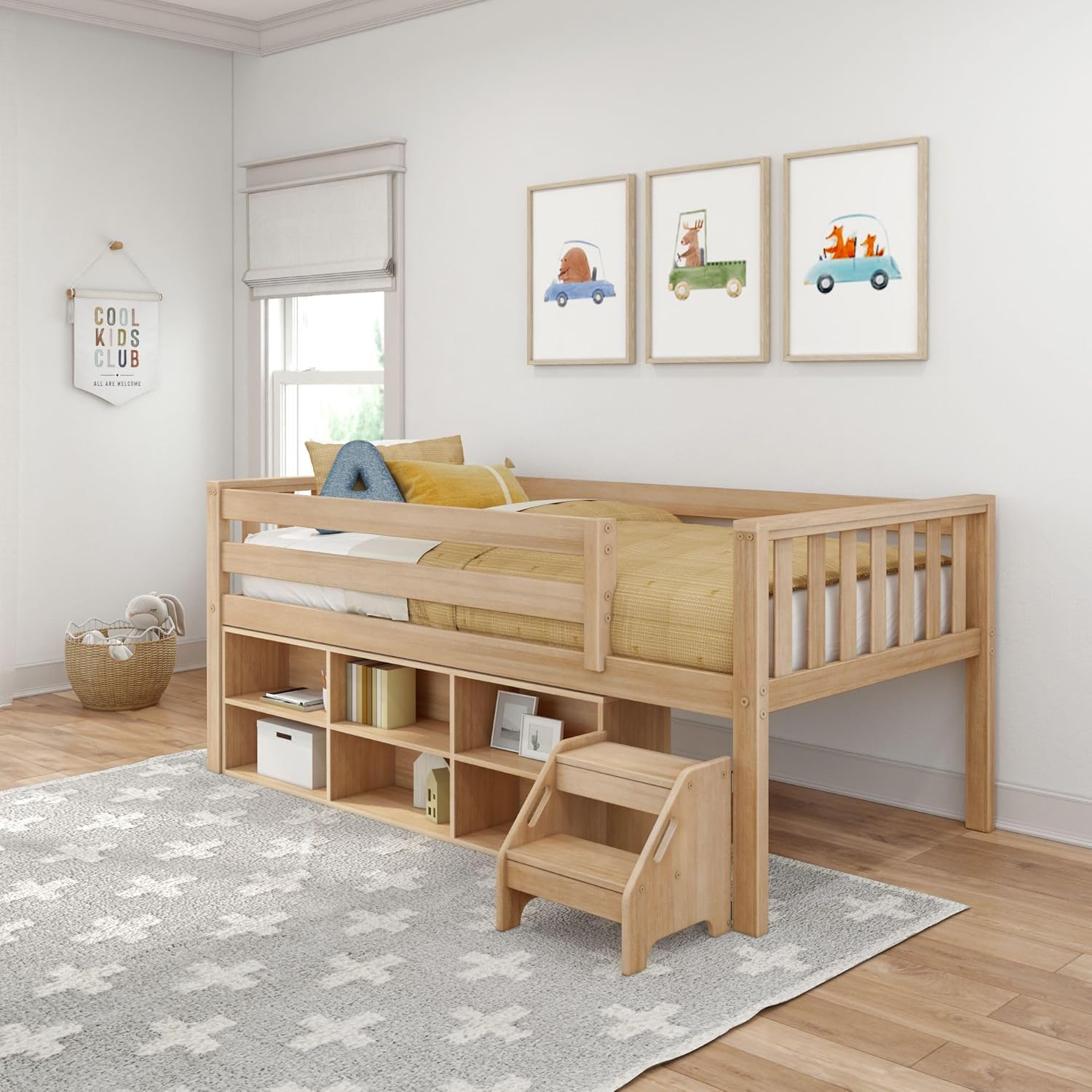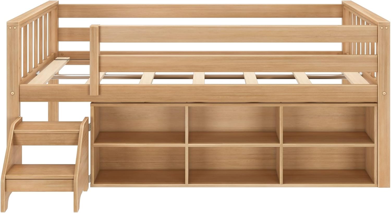 - Twin Low Loft Bed with Storage: This solid wood low loft bed for kids is great for smaller spaces and low ceilings; 6-shelf bookcase provides maximum storage space.