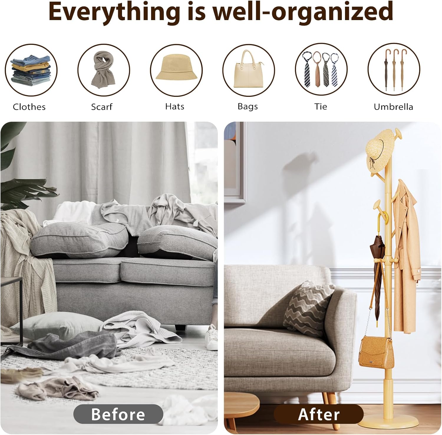 - Inspired by Natural Branches: The unique tree-shaped design allows you to incorporate natural design into your home. This freestanding coat rack features six 45-degree angled hooks to prevent your clothes from falling; the four lower hooks rotate smoothly for easy access
