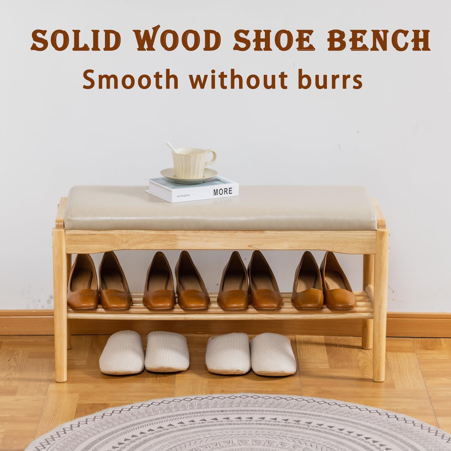 latifolia Small Shoe Bench, Solid Wood Bench with Cushion, 2 Tier Shoe Storage Organizer for Entryway(Nature,31.50''L)