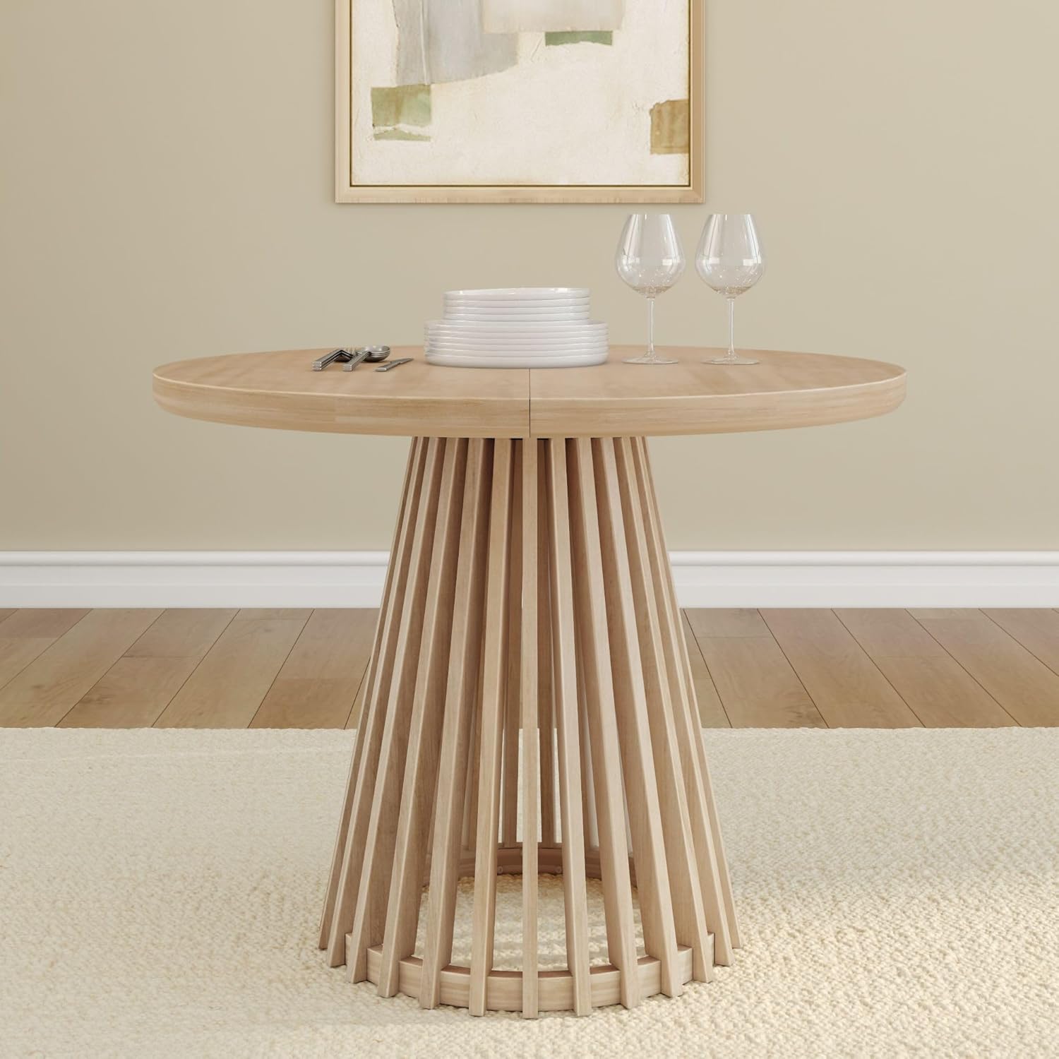 - Statement Style: Round pedestal dining table features a slatted base design that’s light and airy but still sure to catch everyone’s eye. Pair with our Lido Dining Chairs for a stylish combo that’s sure to wow.