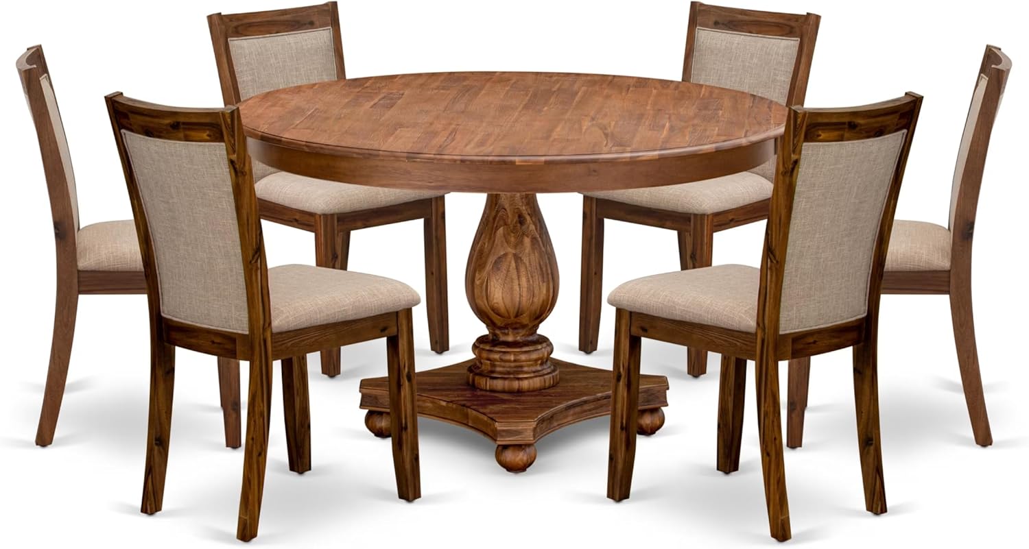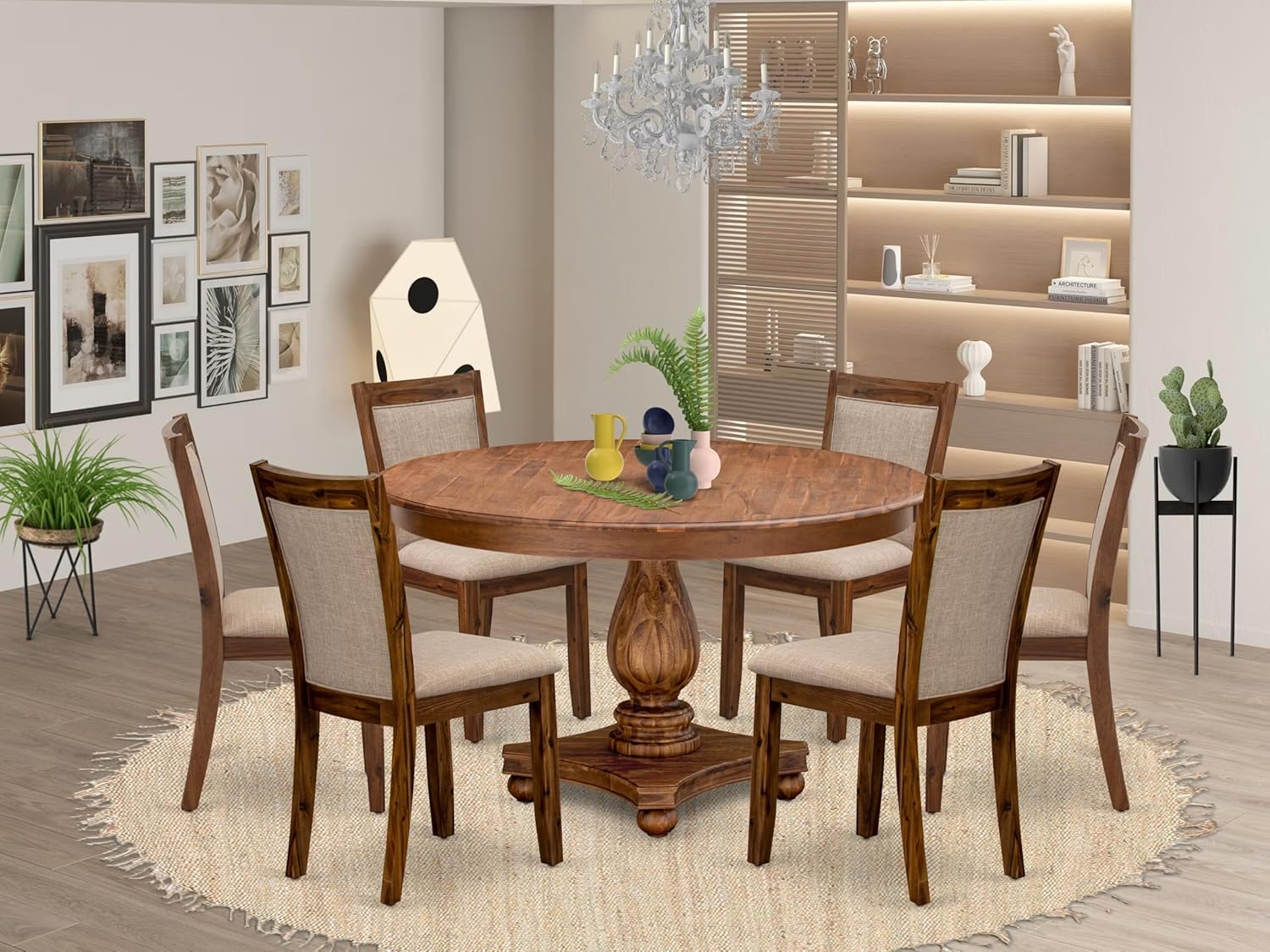 - KITCHEN TABLE SET FINISH: This dining table set beautifully merges comfort and style. The kitchen chairs are upholstered in soft Light Tan Linen Fabric and feature robust antique walnut legs. The table boasts a striking antique walnut top complemented by a classic pedestal base. The harmonious combination of Light Tan and antique walnut enhances both traditional and modern decor. Ideal for everyday meals or special occasions, this kitchen table set adds a touch of elegance to any dining space.