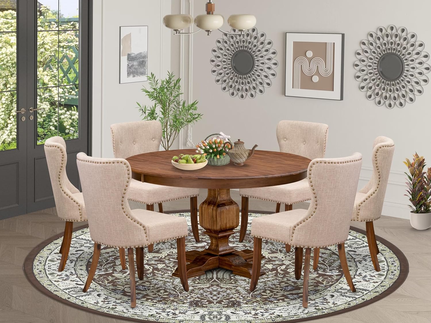 - KITCHEN TABLE SET FINISH: This modern dining table set seamlessly blends comfort and sophistication, showcasing padded dining chairs upholstered in soft Light Tan Linen Fabric with sturdy antique walnut legs. The elegant kitchen table features an antique walnut top supported by a classic pedestal base. Its timeless color complements both traditional and modern interiors, making it an ideal option for both everyday meals and special gatherings.