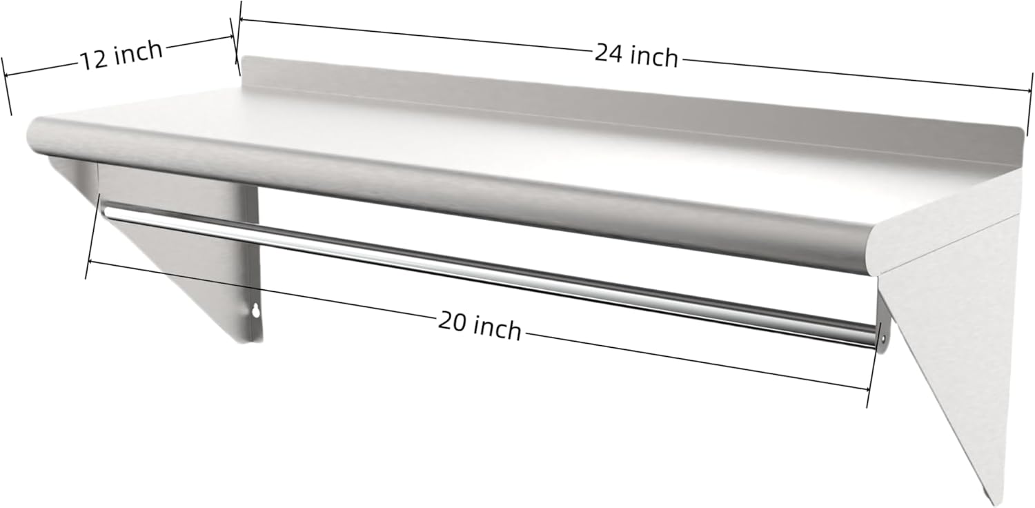 12''x24'' Wall Mounted Stainless Steel Shelf with Suspension Rod, NSF Commercial Metal Wall Mounted Floating Shelf for Kitchens, Restaurants, Food Trucks, Garages, Homes and Hotels
