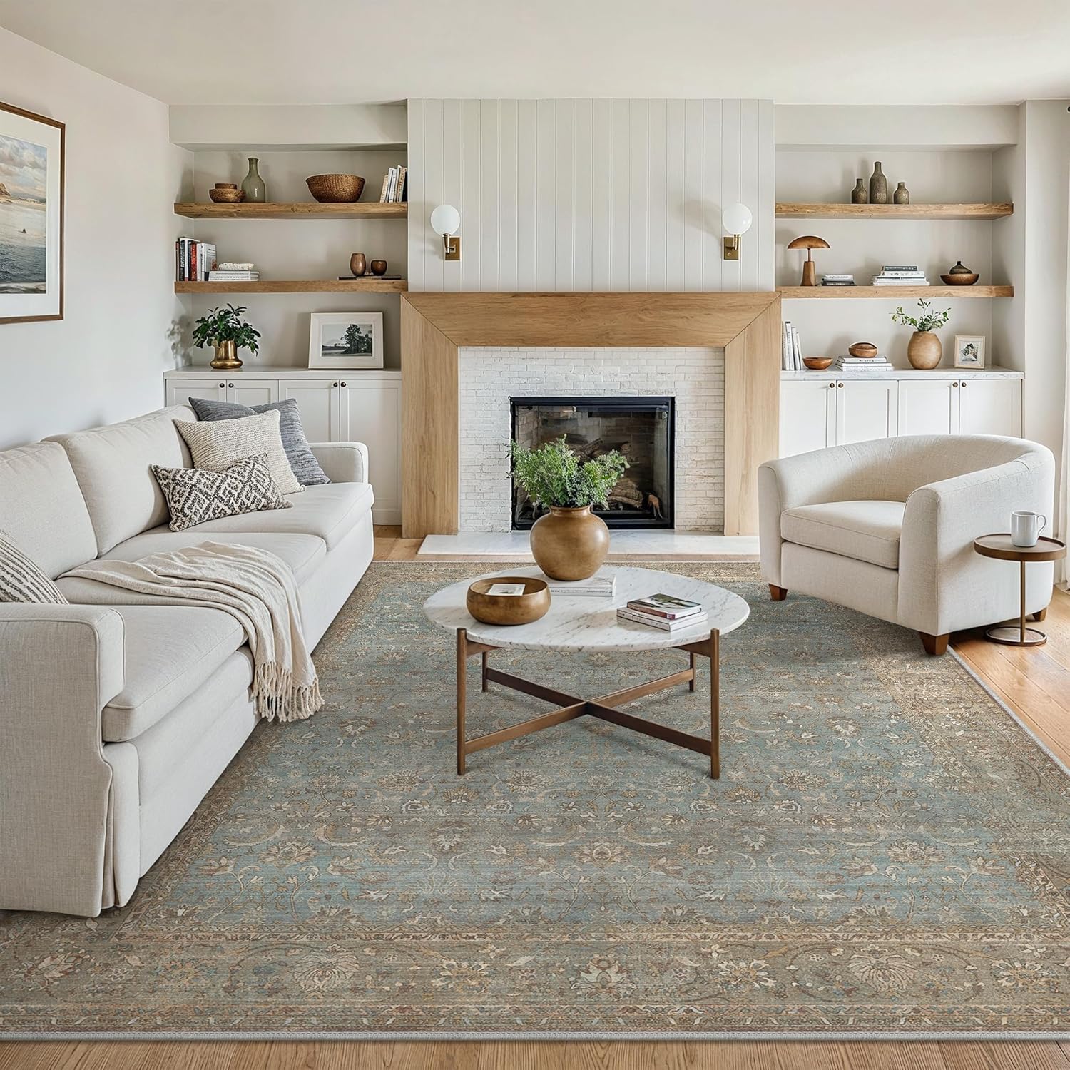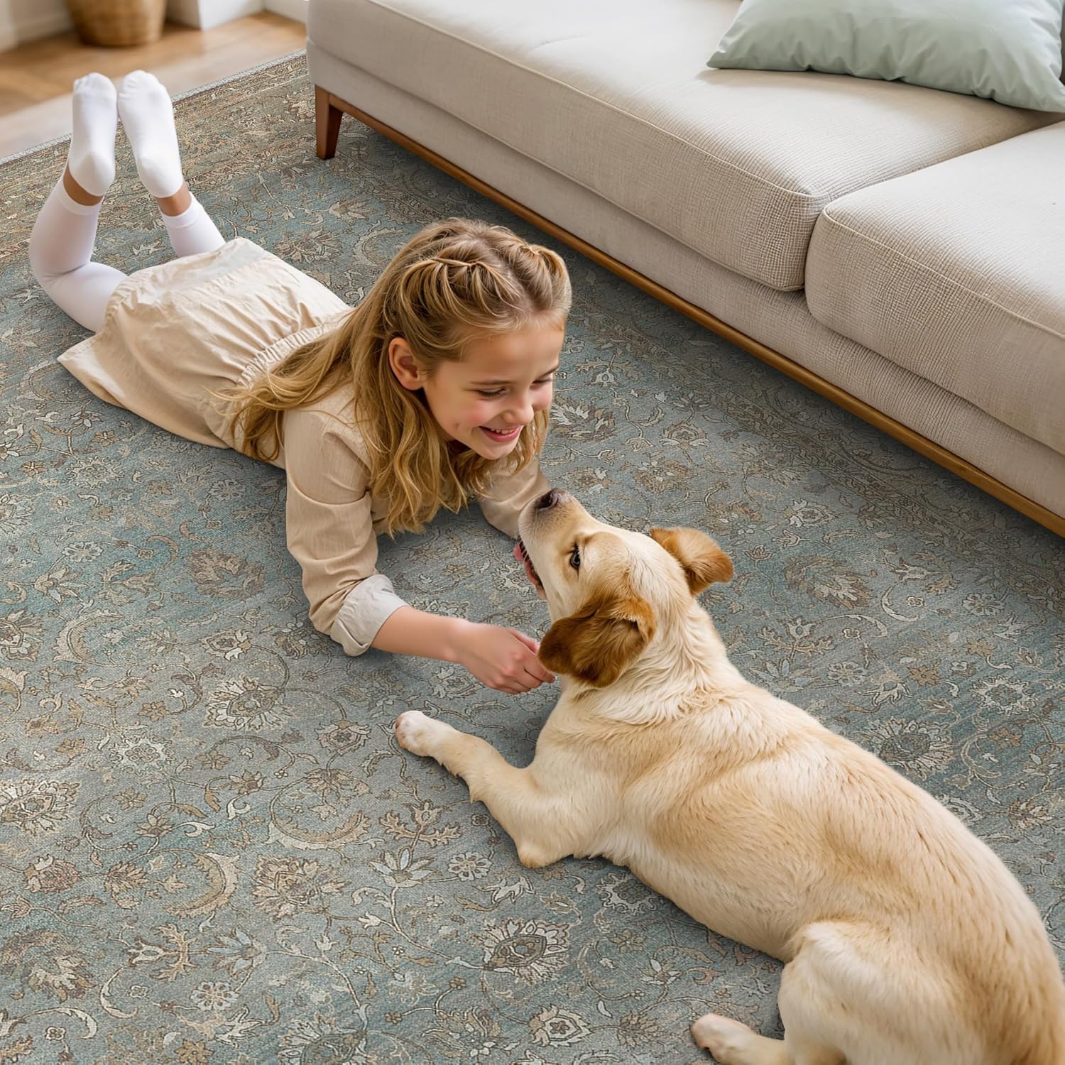 8X10 Area Rugs Machine Washable Rugs for Living Room, Vintage Boho Large Rugs for Bedroom Dining Room, Non Slip Indoor Soft Distressed Lightweight Thin Low Pile Carpet, Weathered Teal