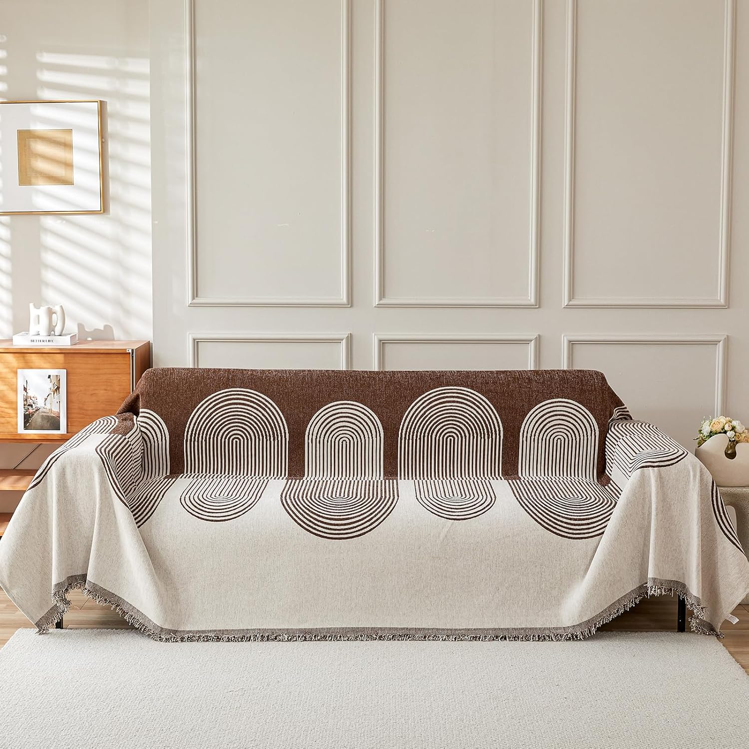 - γππππππ ππππππ πππππγSofa cover with beige and dark khaki, color collocation simple atmosphere, giving a warm and comfortable feeling, pattern using simple lines of arc elements, full of design sense, with fringe lace at the bottom, add romantic and casual atmosphere, other directions full package design, beautiful and durable, extend the service life.