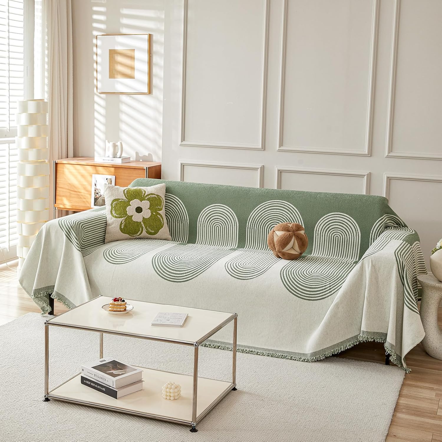STACYPIK Green Geometric Couch Cover Boho Sofa Cover for Sectional Non-Silp Sofa Covers for Dogs Reversible Beige Couch Cover Loveseat Cover L Shaped Furniture Protector for 3 Cushion Couch-71X150IN