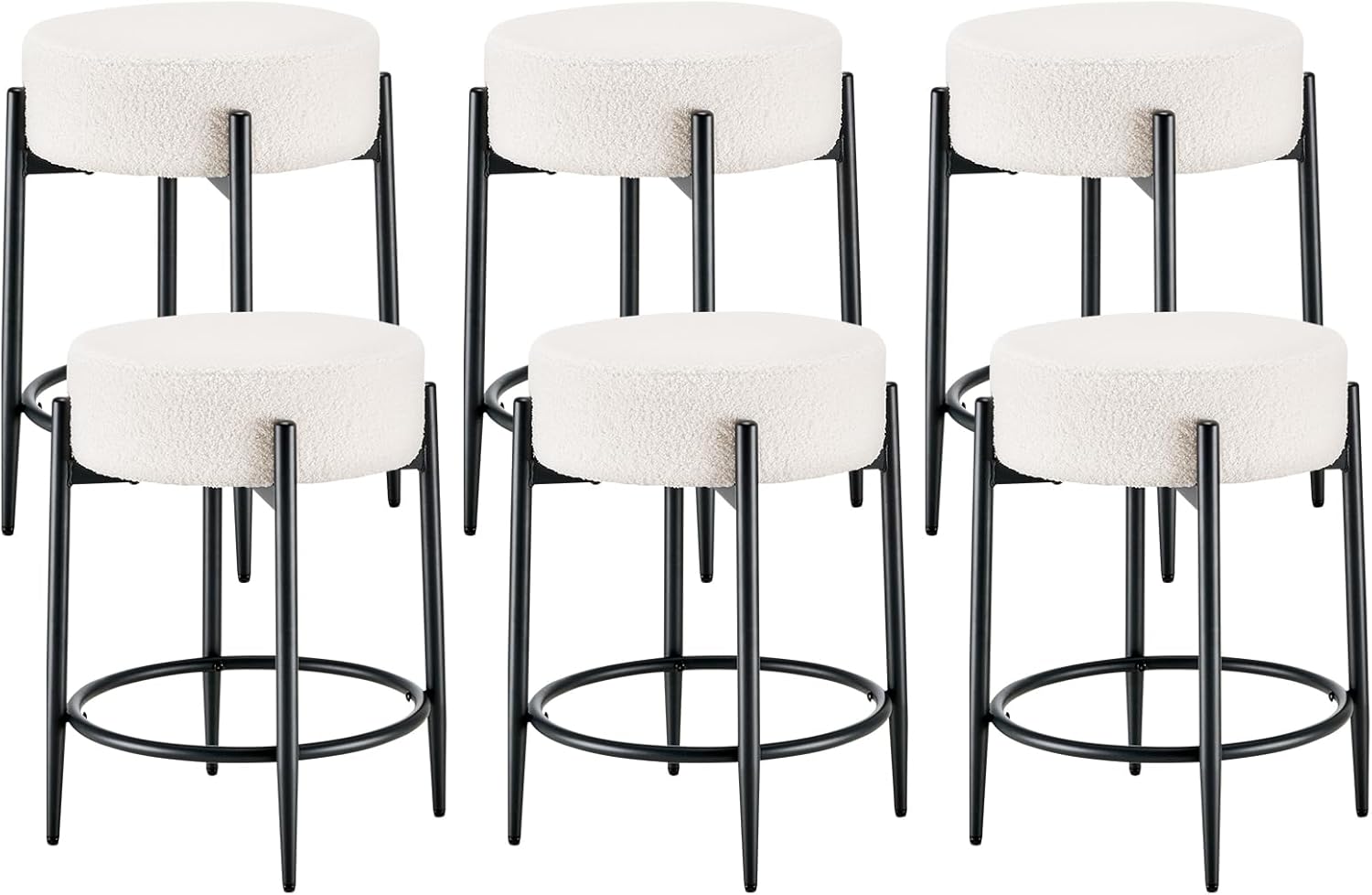Dining Room Chairs Set of 6, 23.6" Sherpa Backless White Boucle Dining Chair with Black Metal Legs, Mid Century Modern Living Room Round Upholstered Chairs