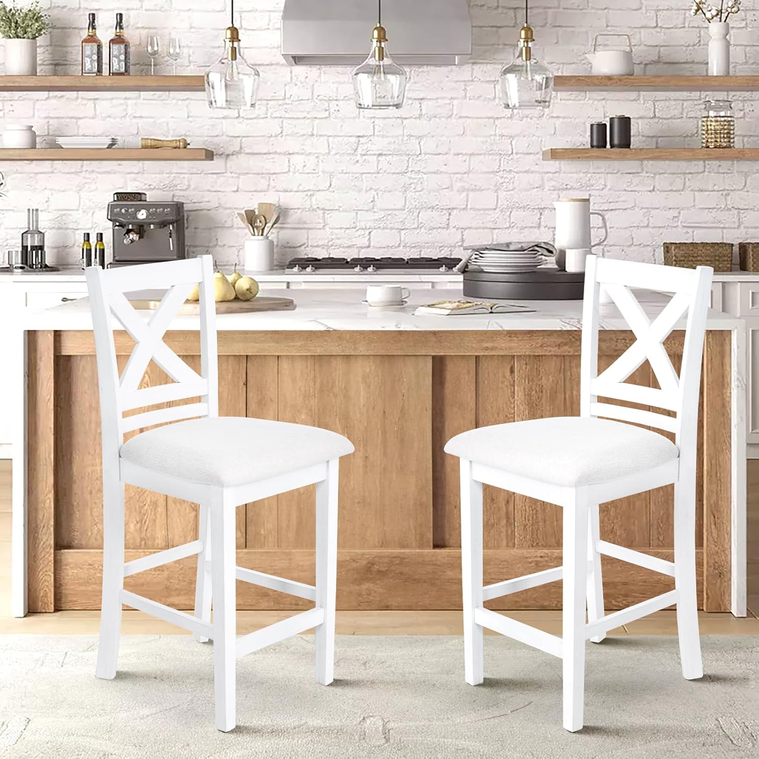 Upholstered Counter Height Bar Stools Set of 2, Modern Kitchen Island Barstools Chairs with Cross Back and Wood Legs for Dining Room Bar, Grey White Wash