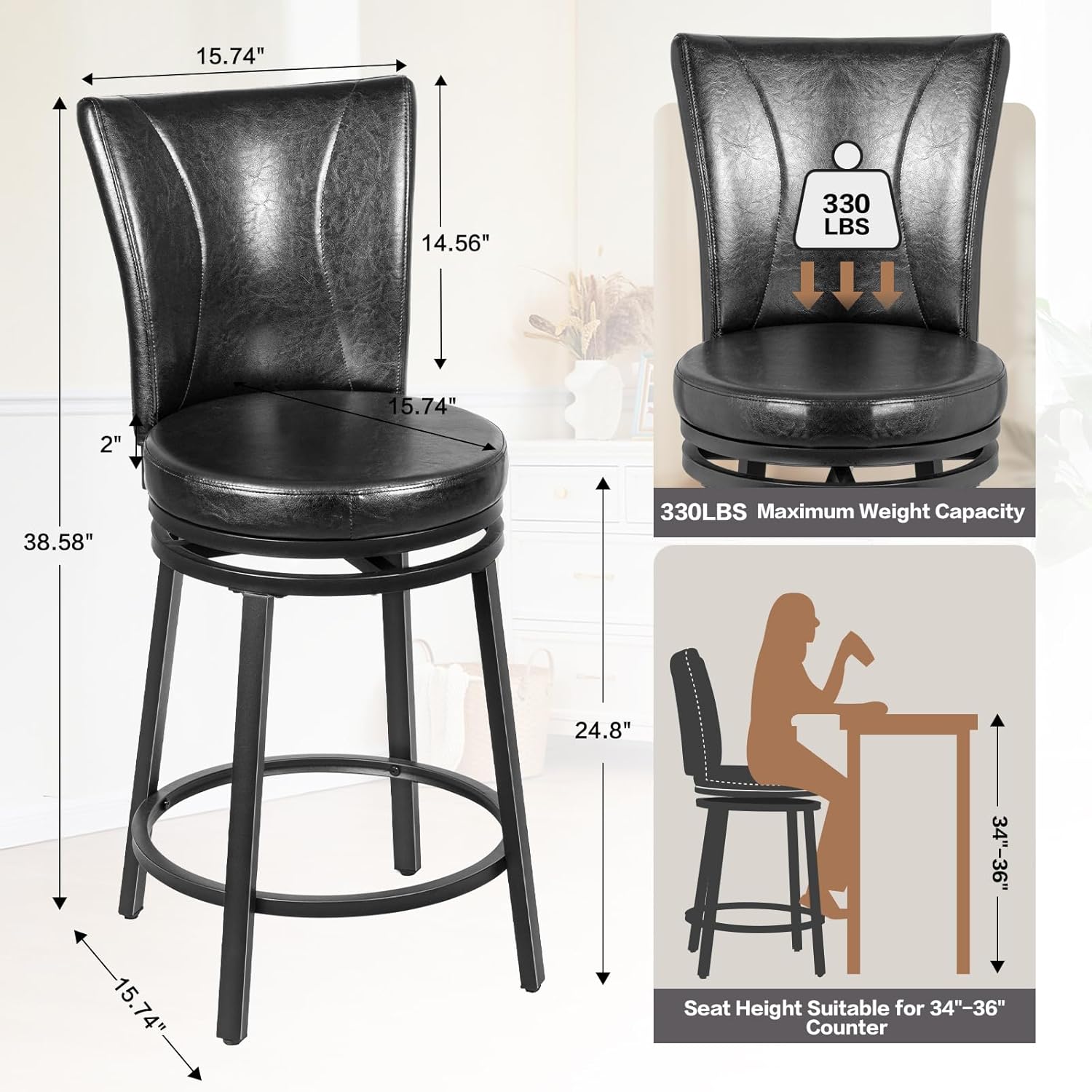 - 【Excellent Stability】 The base frame of the kitchen island swivel barstools is made of sturdy metal to ensure structural stability. Wrap-around legs provide excellent support, and bar stool feet with cushioned feet prevent floor wear and provide added support and stability. Eliminating wobble concerns, each leg is reinforced with high quality bolts for high chair stools strength and durability. Weight capacity Up to 330 lbs.