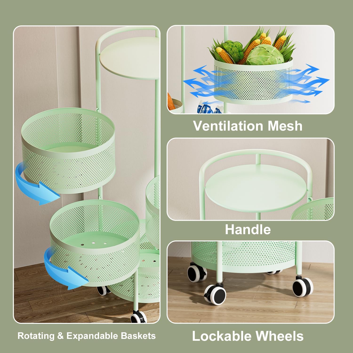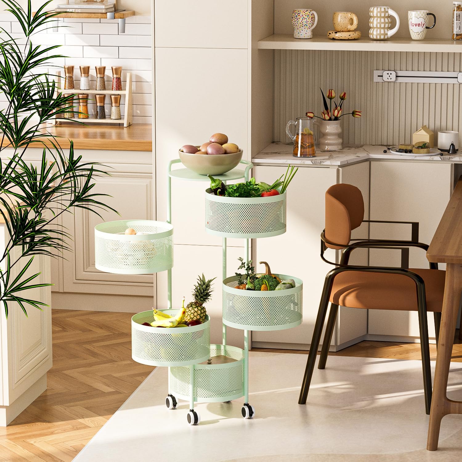 JAQ Rotating Fruit Basket, 5-Tier Metal Sturdy Kitchen Storage Rack Shelf Carts No Assembly on Rolling Wheels for Fruit Vegetable Grocery Corns Potato Onion (5-Tier, Green)